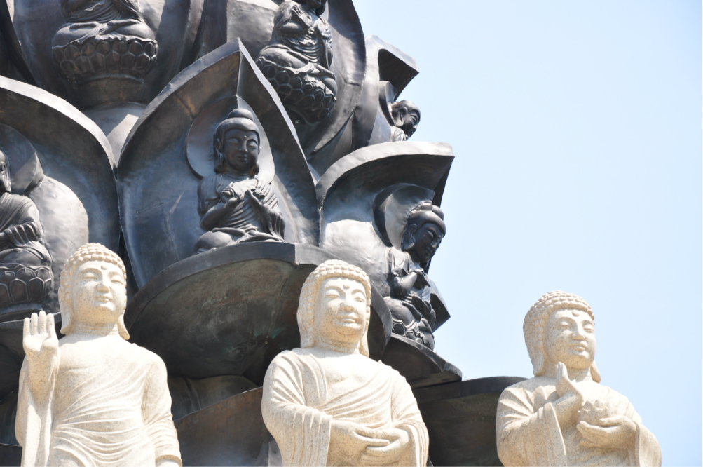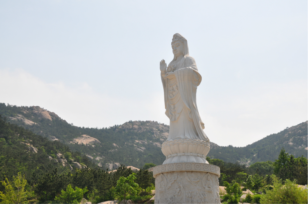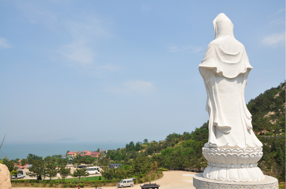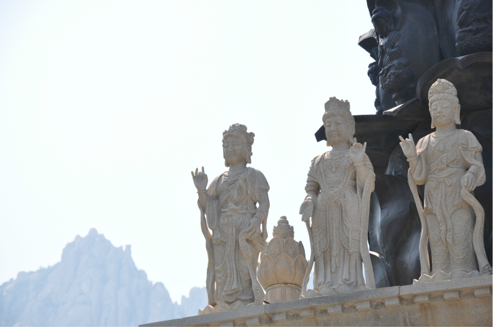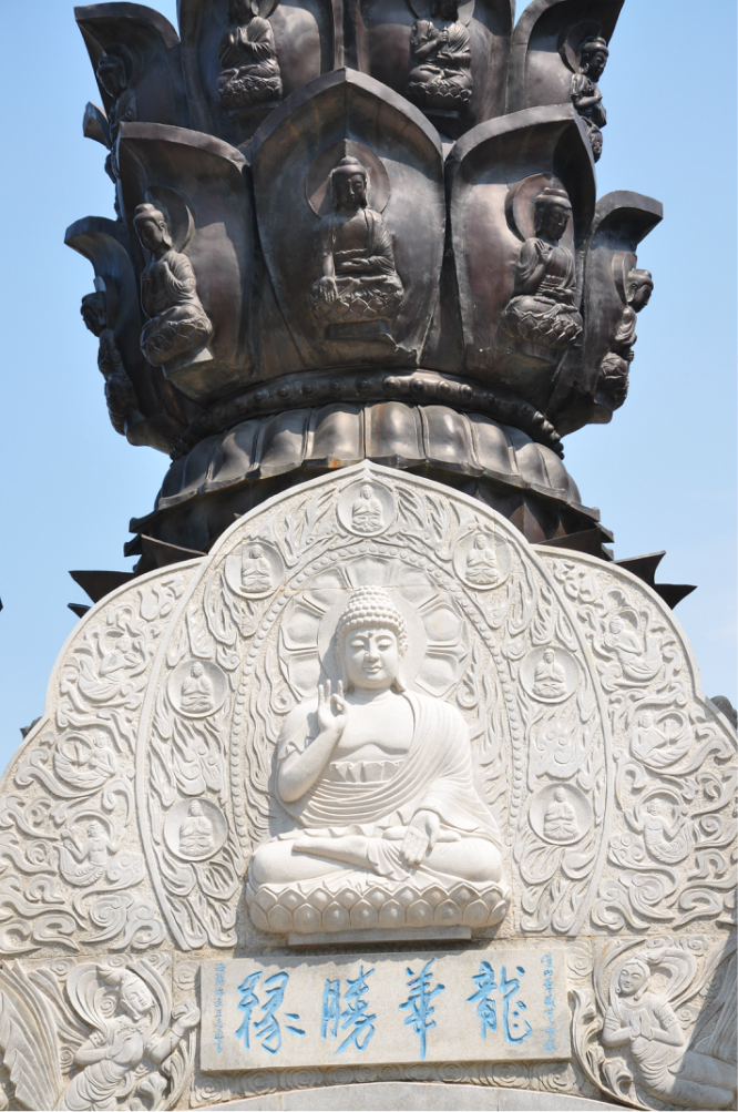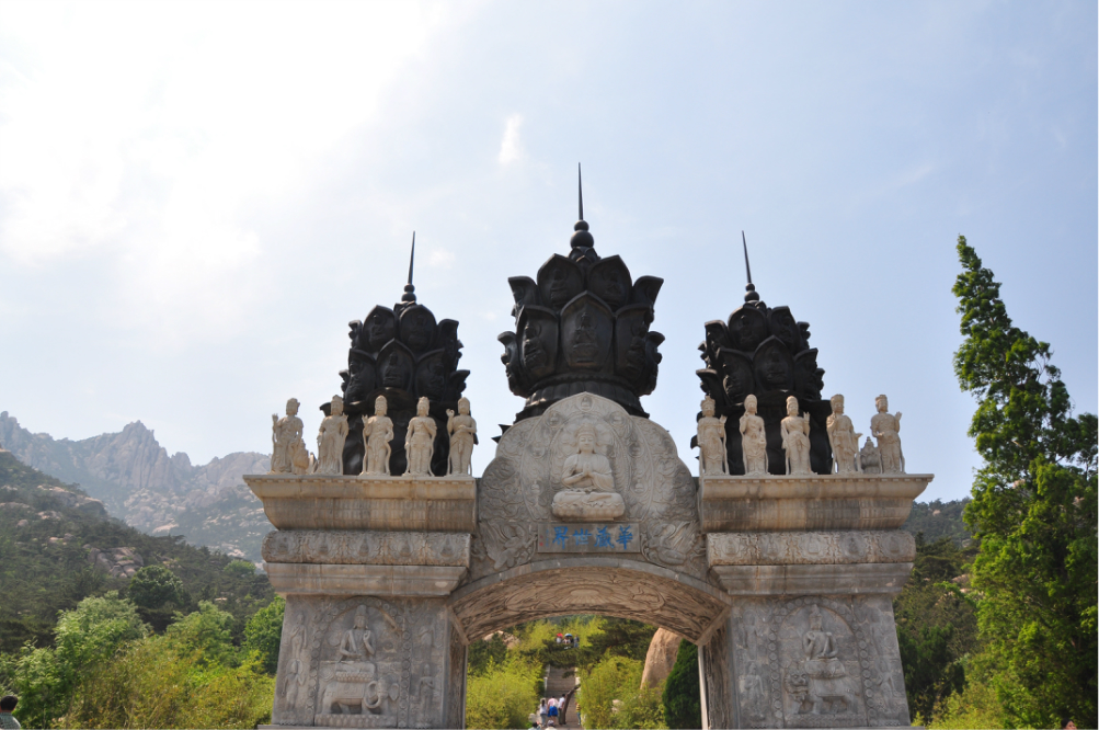 现在的华严寺是复建的。巨大的观音菩萨 雕像面向无垠的大海。拾级而上,便来到了最有特色的山门前——华藏世界门。山门上方是三朵巨大的铜铸莲花。每一片莲花瓣中都有一尊佛像,寓意“一花一世界,一叶一如来”。山门正中是佛祖释迦牟尼佛,其左右上方分列十大菩萨 ,下方左右是文殊和普贤菩萨 ,这样有了“华严三圣”。穿过此门就意味着进入了华藏世界。司机兼导游告诉我们,这一路上有一百零八朵莲花,如果都能踩到,自然吉祥如意。