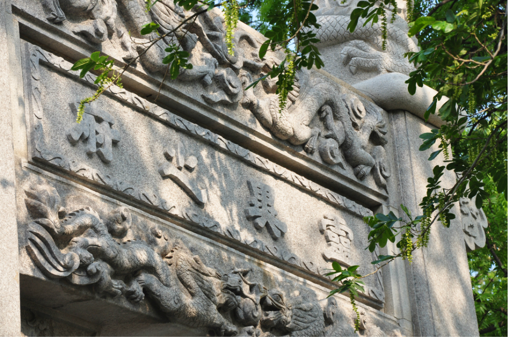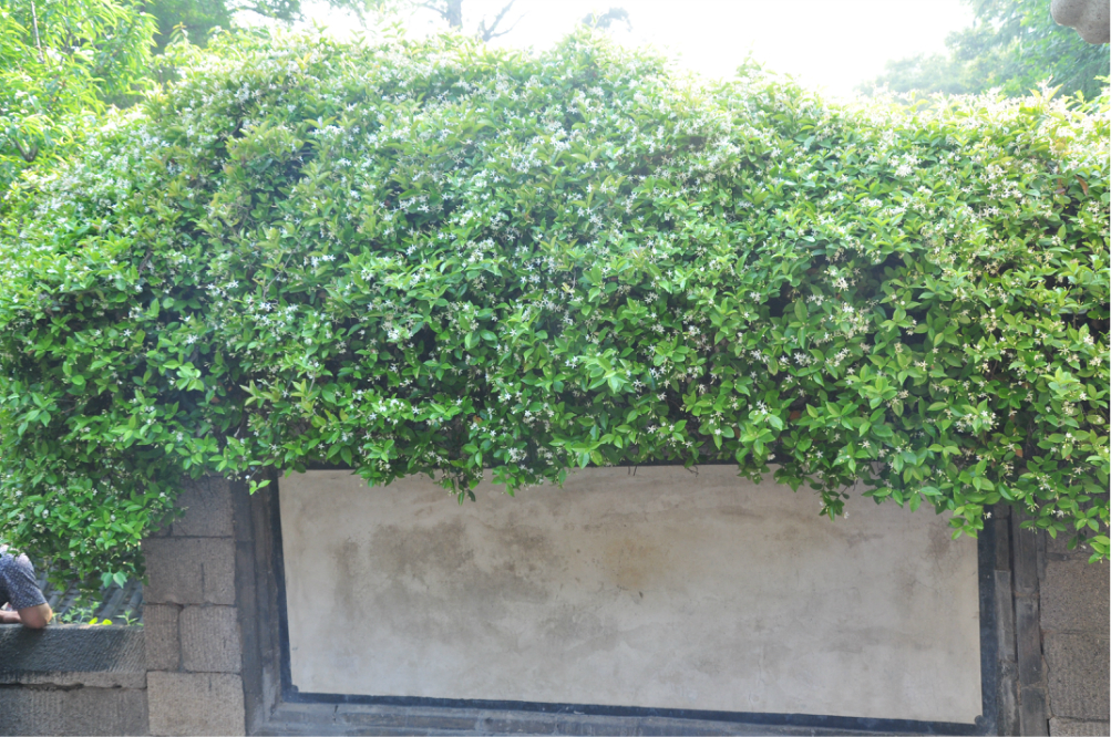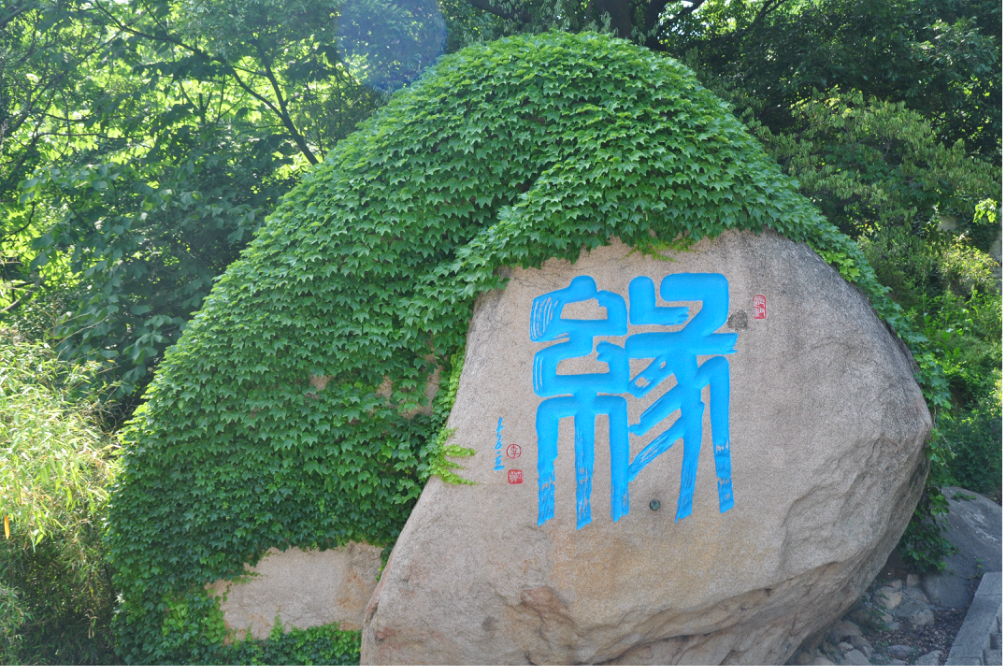 这一路上的石刻题字非常惹眼。随后的“缘”字出自齐白石先生的弟子李立之手。而这块石头也颇具特色。正面看圆润平和 ,绿茵茵的爬山虎似乎给这石头做一个很贴身的帽子,俨然成了一个整体。