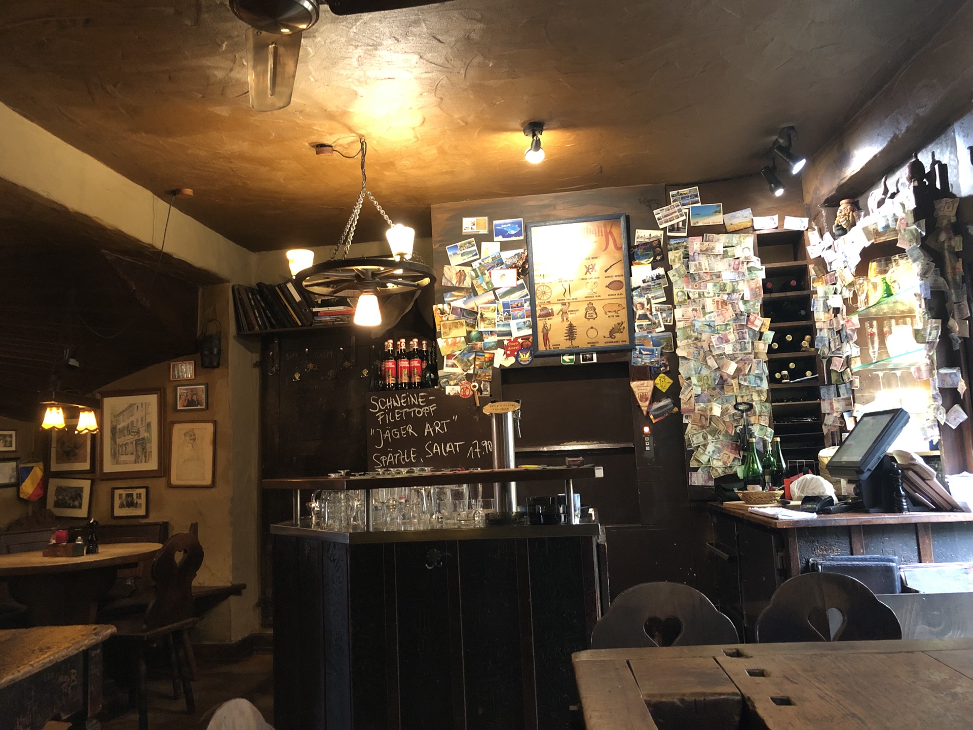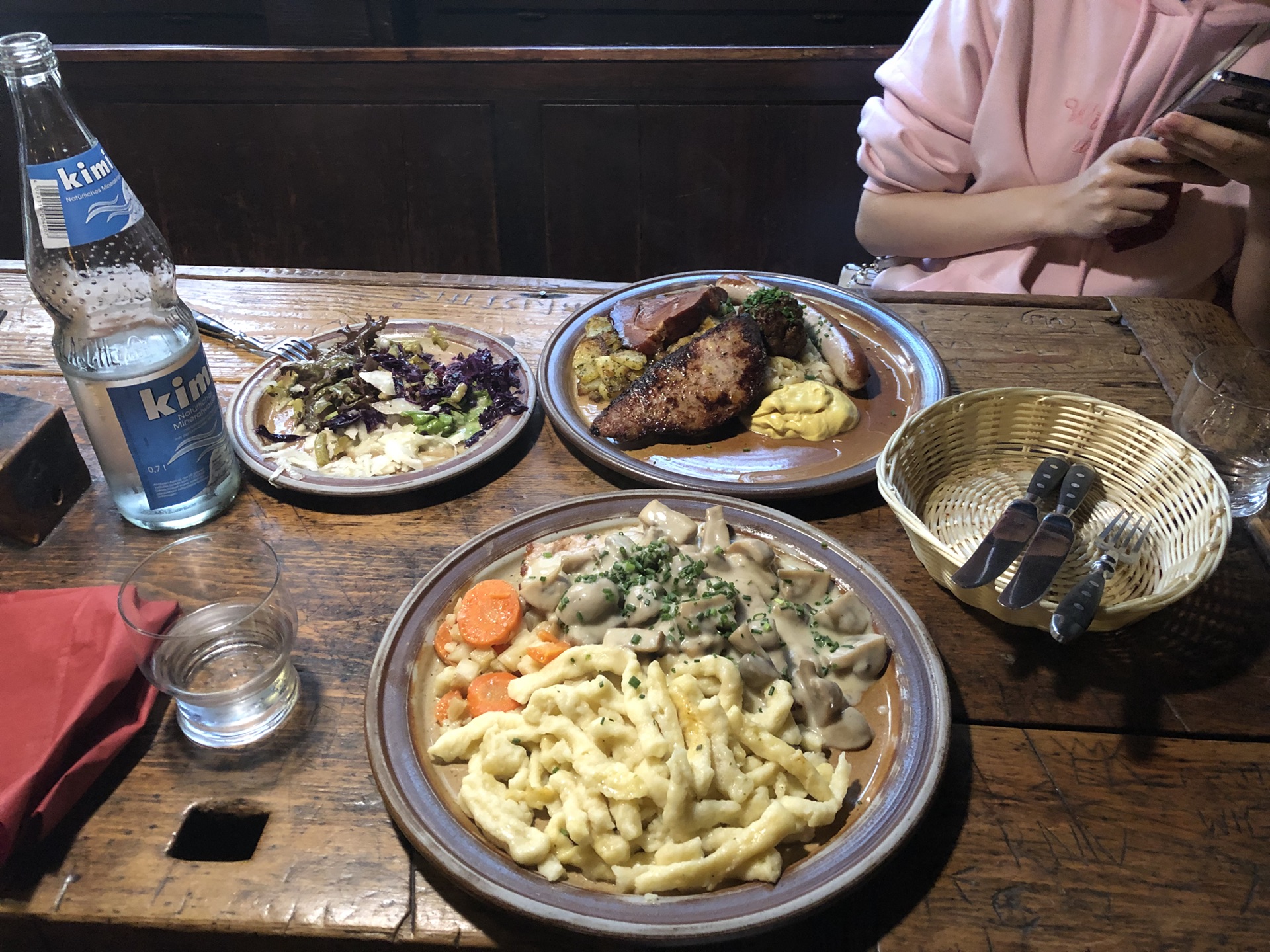 网红店:炸猪排银行。。(Schnitzelbank)就在海德堡老城主街上旁边的小分支上,很容易找到。我们掐准了时间赶在了开门的时候第一个到,而且幸运的是不用预约就有位置。老板一个人太忙了,但是味道很好,量很足!我和媳妇儿吃了一共37.7欧的两大盘大肉