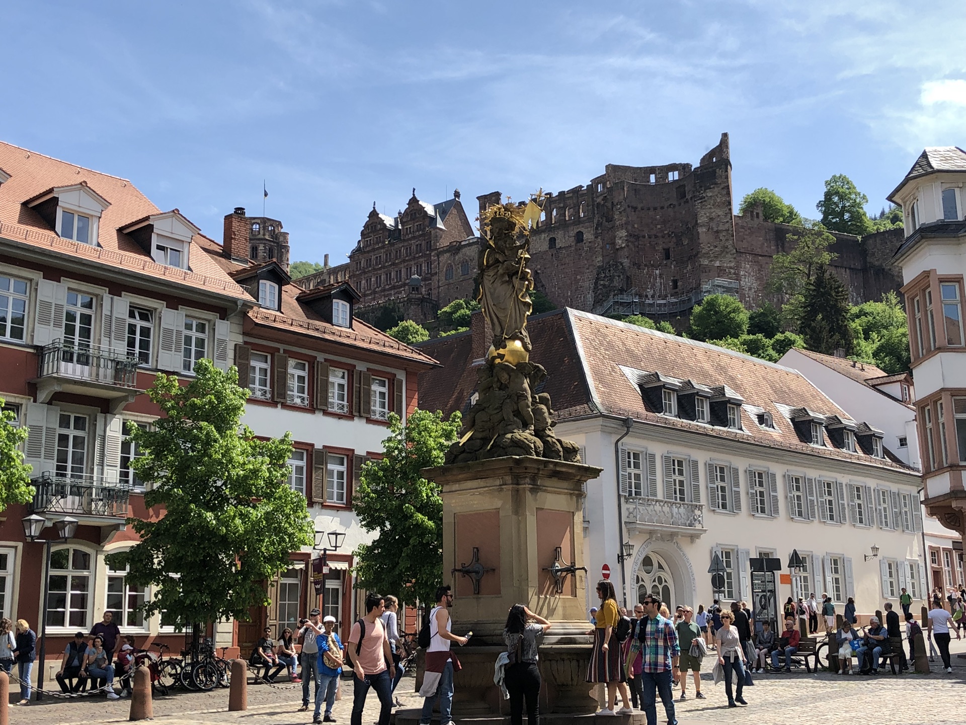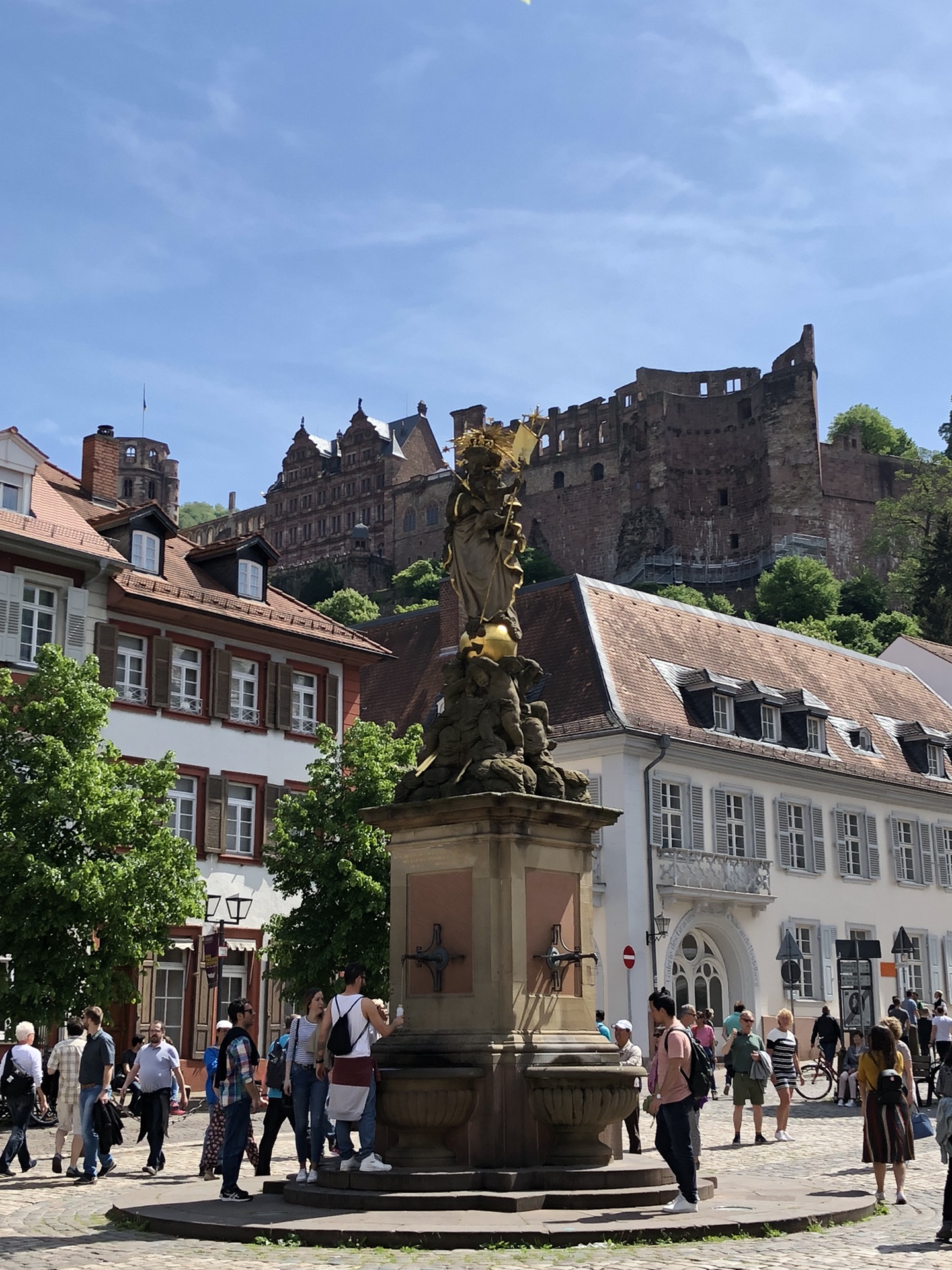 继续往东的粮食广场上能看到远处的海德堡城堡,我们即将去做缆车