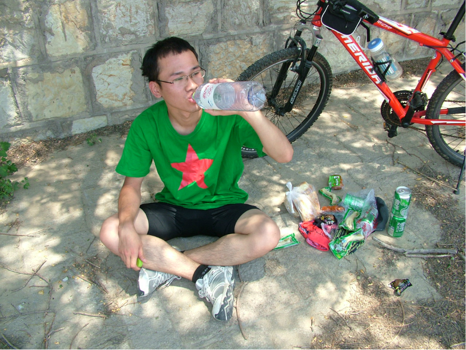 最让我感动的是在这样失魂落魄的骑了一个多小时后,看见有一西瓜摊,一个大妈和几个家里人在乘凉聊天,要了个小西瓜,3元。是我吃过最好吃的西瓜!大妈问我从哪来到哪去,吃饭没,哪里人。聊了一会,大妈突然从车里拿出一塑料袋馒头,和一碗菜,可能是他们的晚饭。让我吃,我也没有逞强,狼吞虎咽两个馒头下肚。慢慢的人越聚越多,都是周围的老乡,一起聊天,很开心。一个年轻人骑我的车玩,说很佩服我,我只是相视一笑,毕竟听不懂当地方言。额。
