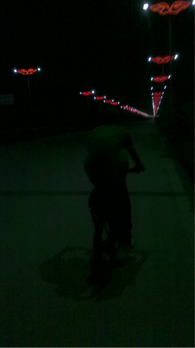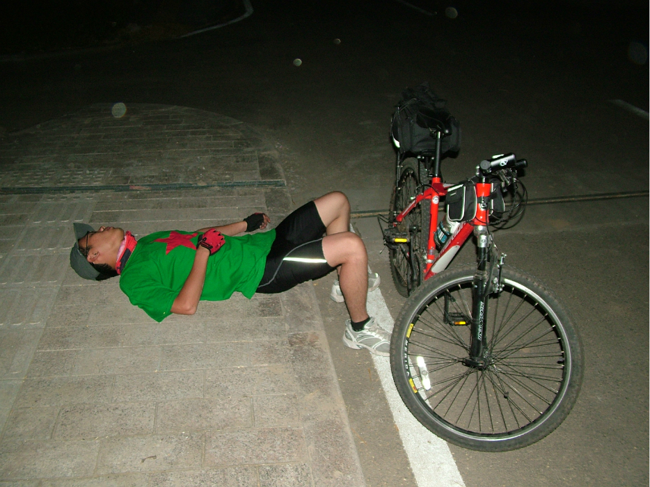 慢慢骑速度最快16,脚伤浸着汗水疼痛无比,体力也不支,趁打气的空档休息。水再次告罄,忍着到了一个加油站,到超市加了自来水,走时售货员送我一根棒棒糖,当时差点哭出来。这时候已经天黑,还没吃饭,食物只有水。棒棒糖支撑着前进。