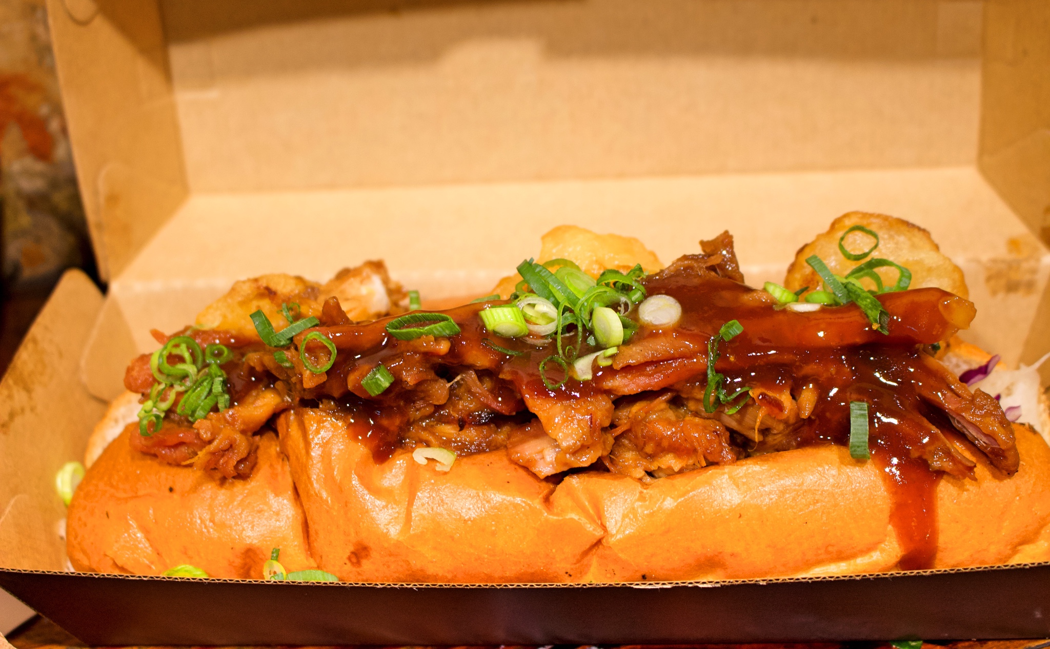 Sticky BBQ Pork有股烟熏味,也很受欢迎。下图能看出,肉是慢炖后,已经碎成了丝状,表面浇上一层烧烤汁BBQ sauce,对我来说有点甜,不过澳洲人很喜欢。软面包里还加有油炸洋葱圈。