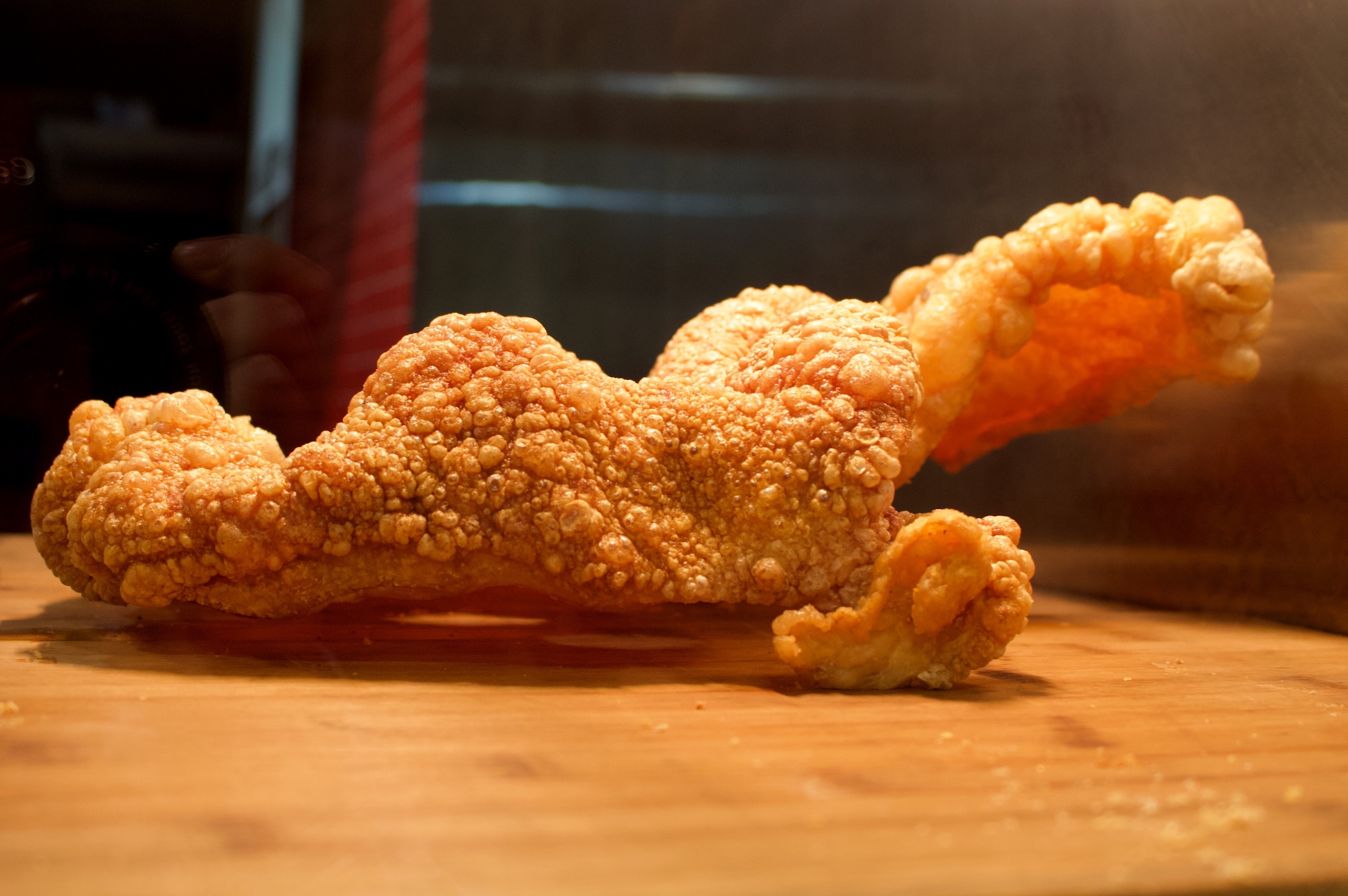这家店另外一个的卖点就是烤猪皮,很多人把它当薯条吃。菲律宾朋友说,马尼拉遍地都是卖烤猪皮的,堵车时,就有人背着个大框来向车内等着无聊的人兜售。