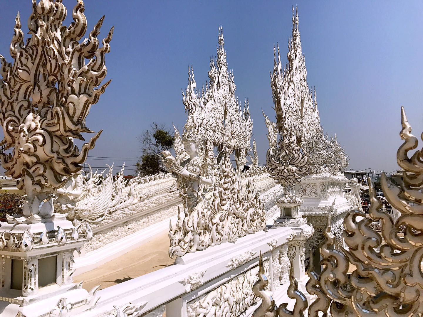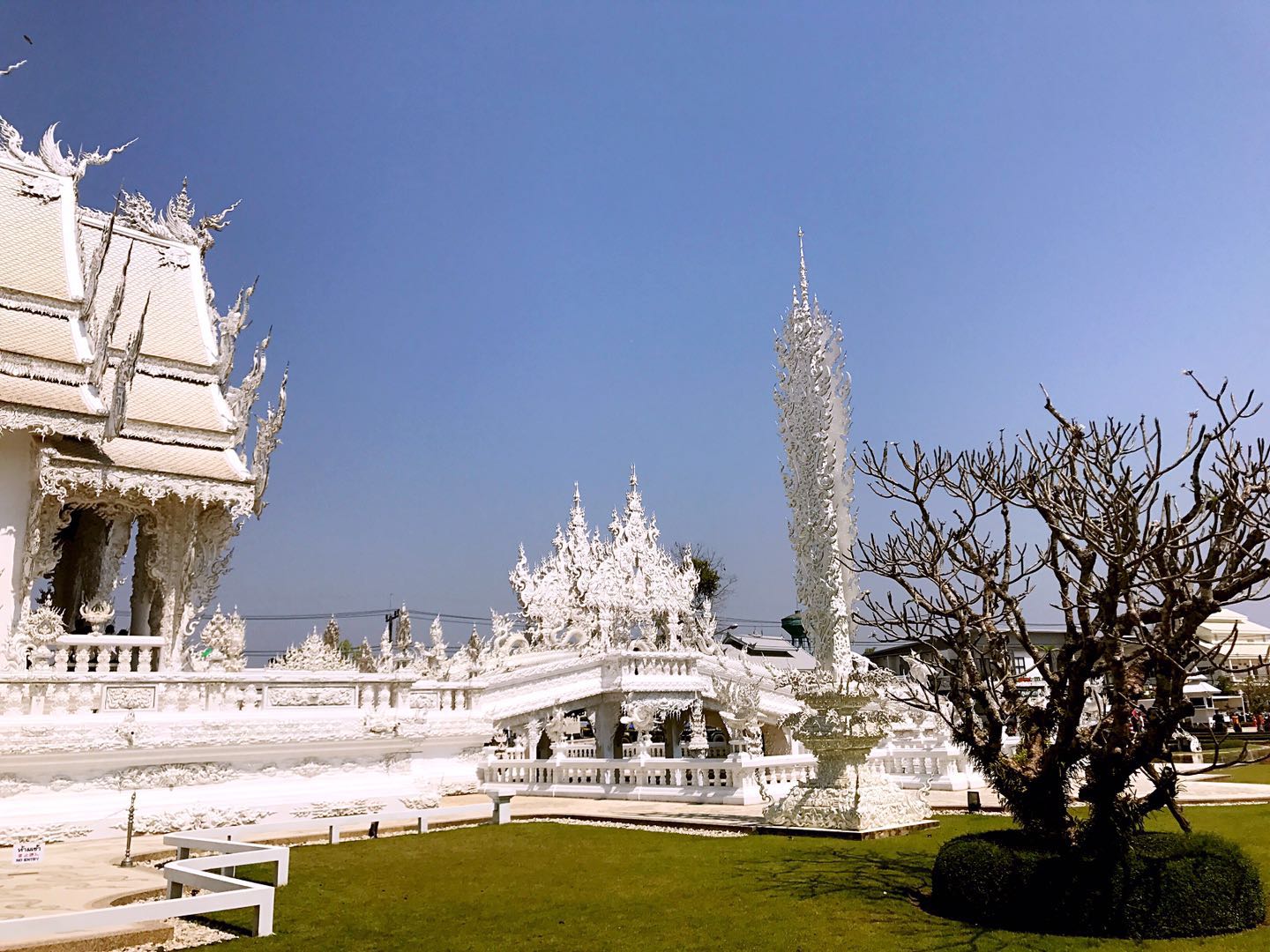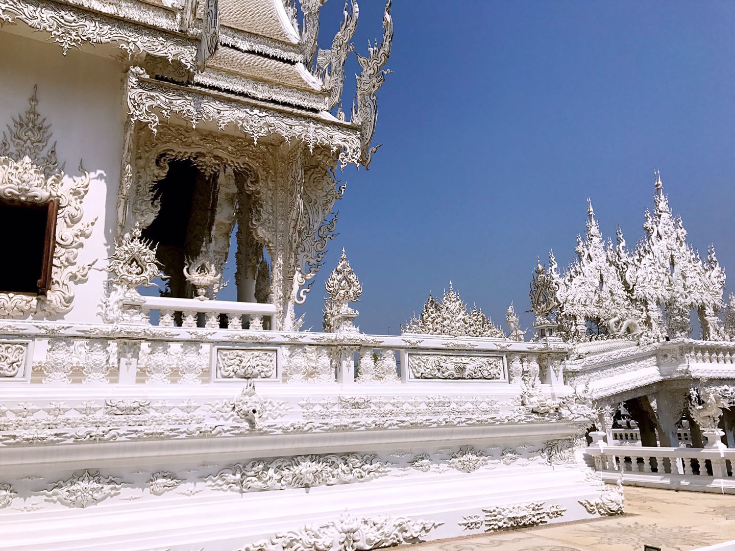 白庙比想象中要小很多,不过美确实是真的美,与泰国其他地区的寺庙那种金碧辉煌不同,整个建筑头都露着一种圣洁的气质,可以从中感到建造着的虔诚。寺庙建造者说是为了已逝国王普美蓬的王妃建造的,不知道是不是有点效仿泰姬陵的意思。