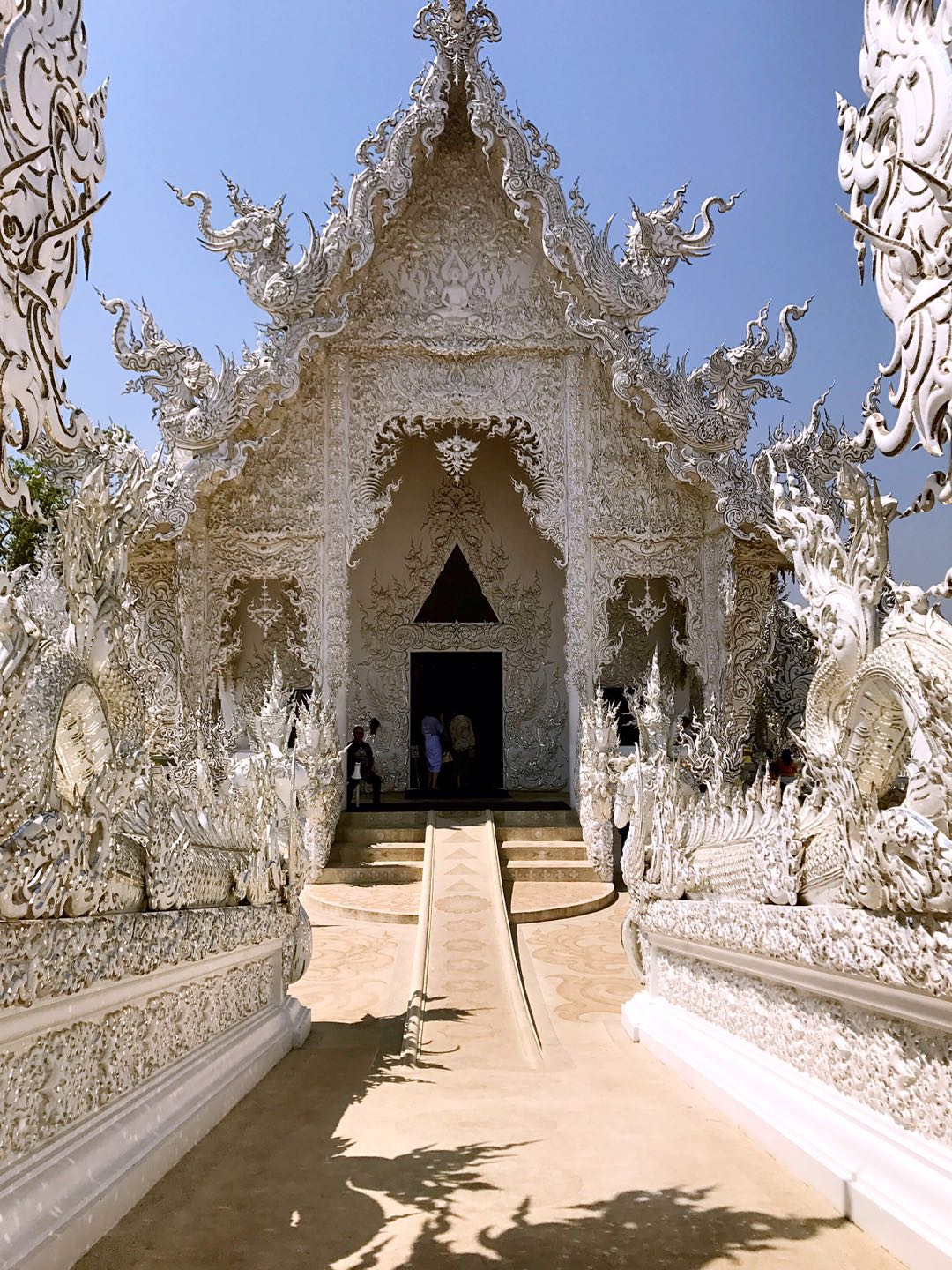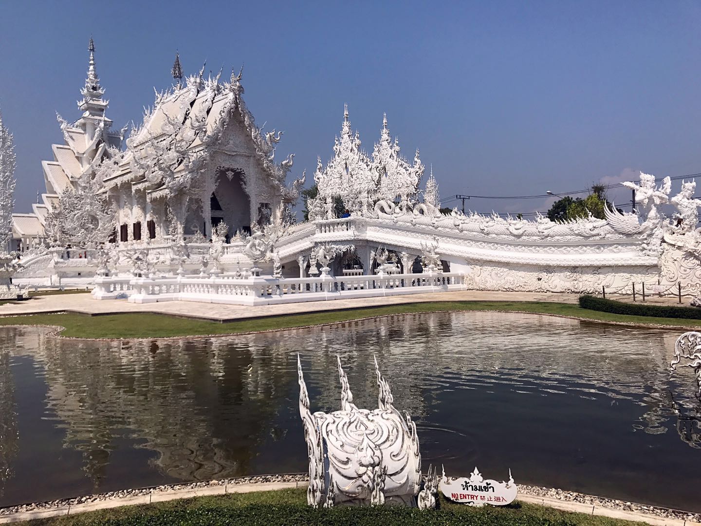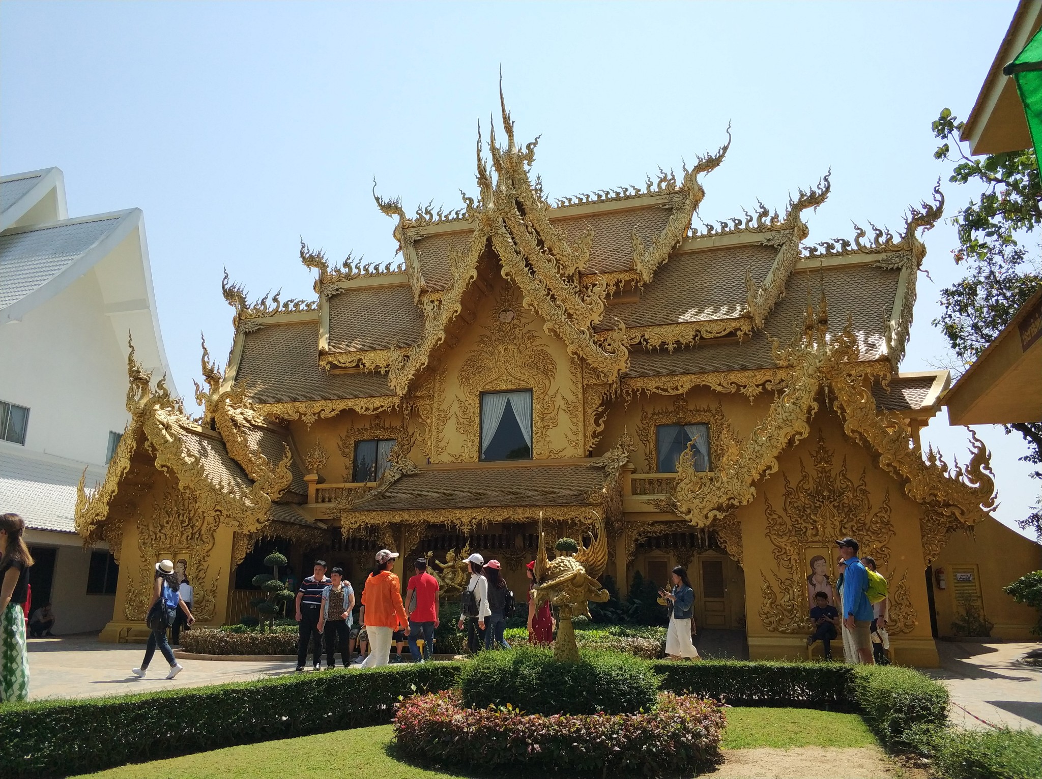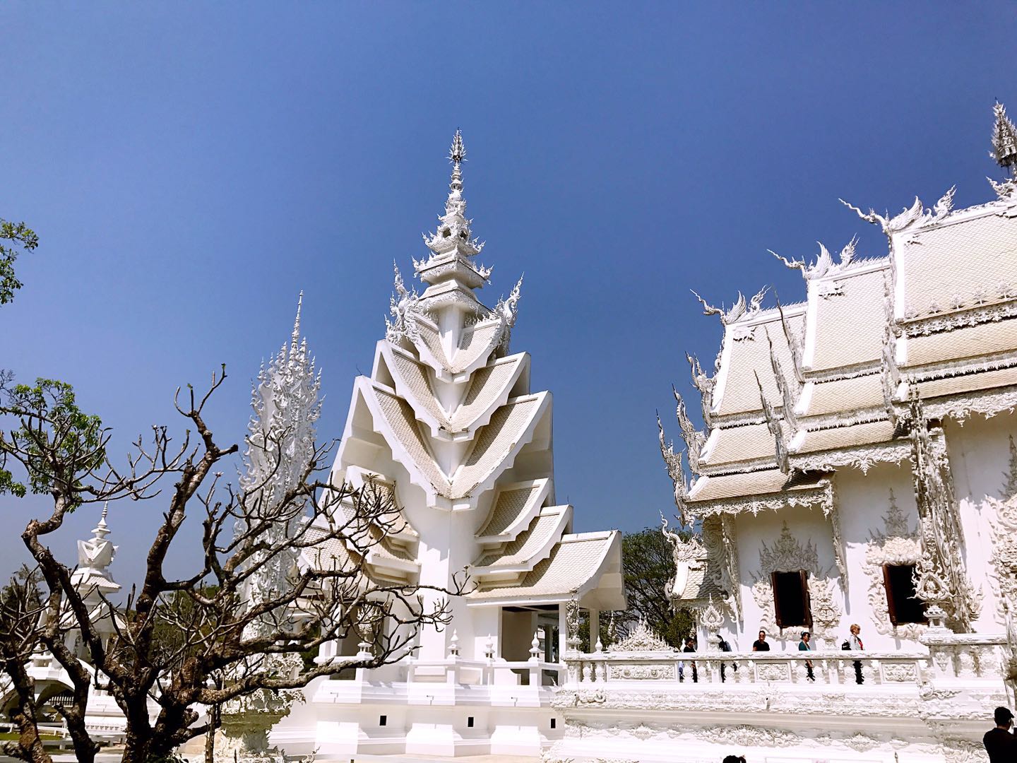 白庙比想象中要小很多,不过美确实是真的美,与泰国其他地区的寺庙那种金碧辉煌不同,整个建筑头都露着一种圣洁的气质,可以从中感到建造着的虔诚。寺庙建造者说是为了已逝国王普美蓬的王妃建造的,不知道是不是有点效仿泰姬陵的意思。