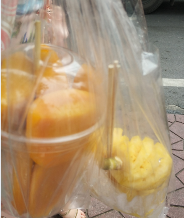 就这个小波罗和芒果,500泰铢一大包,特别甜,就在大皇宫的出口出来过马路就有一帮人叫卖,大热天买一点吃非常爽。