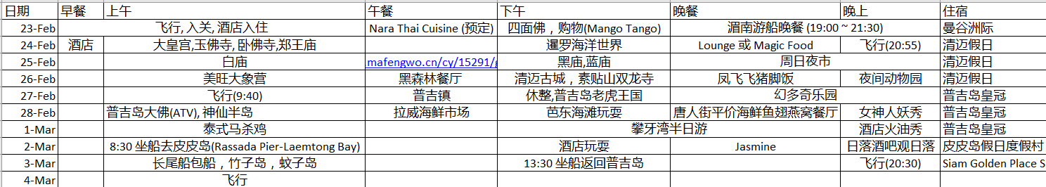 春节前后总想要从北方凛冽的寒冬逃离到南方岛国,去年选了冲绳,今年就再往南一点,泰国成了不二选择。泰国虽然对于咱们国人来说简直是熟悉得不能更熟悉得旅行目的地,但对于楼主我来说还是一个未踏足过的陌生国度,所以在做旅行计划的时候总是想要尽可能得玩到更多的地方,毕竟我这个人去任何地方之前都是按照我这辈子只会去一次来计划的,所以一定要综合各方面考量,不留一点遗憾。老规矩,先上Excel表格: