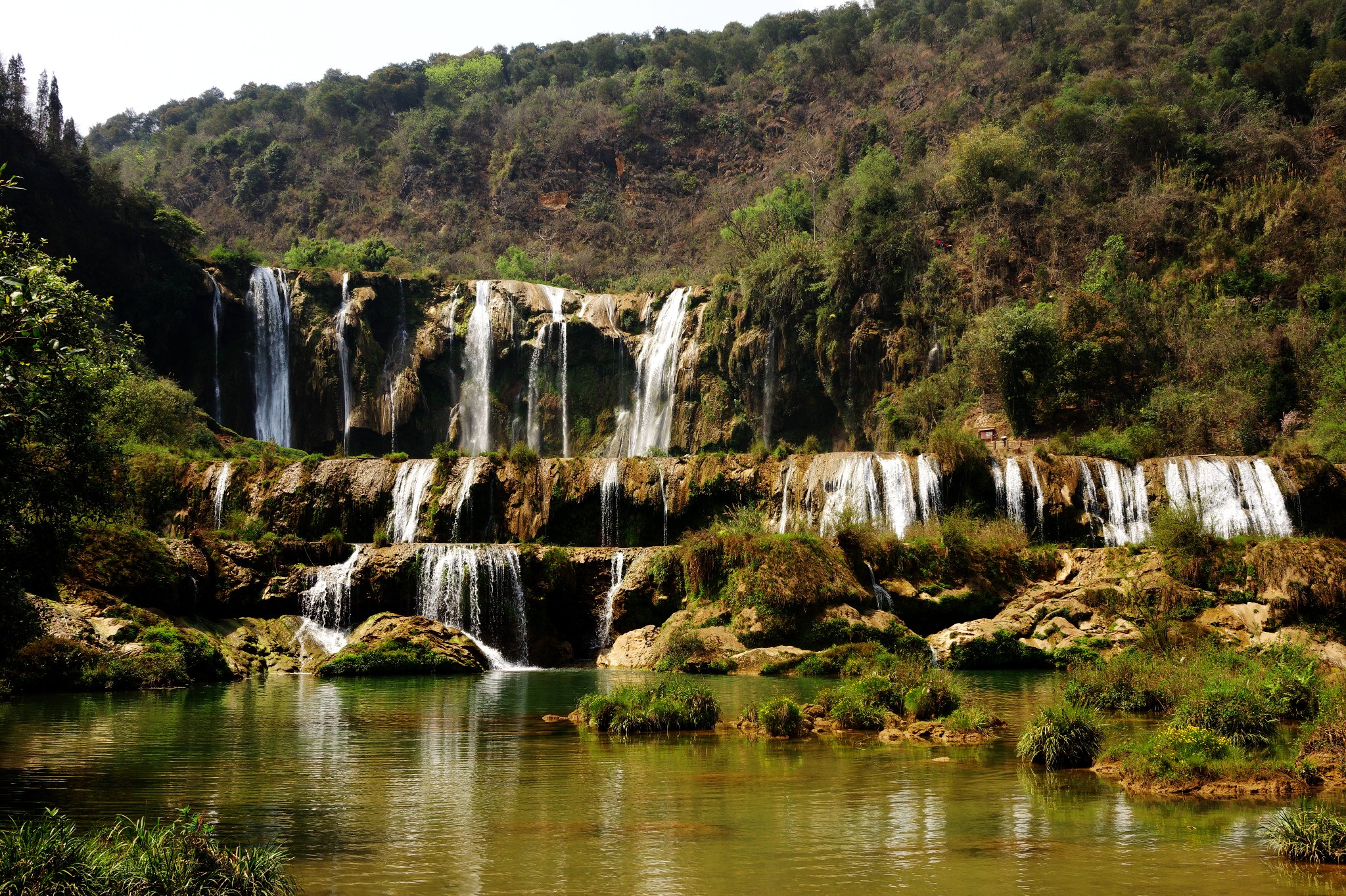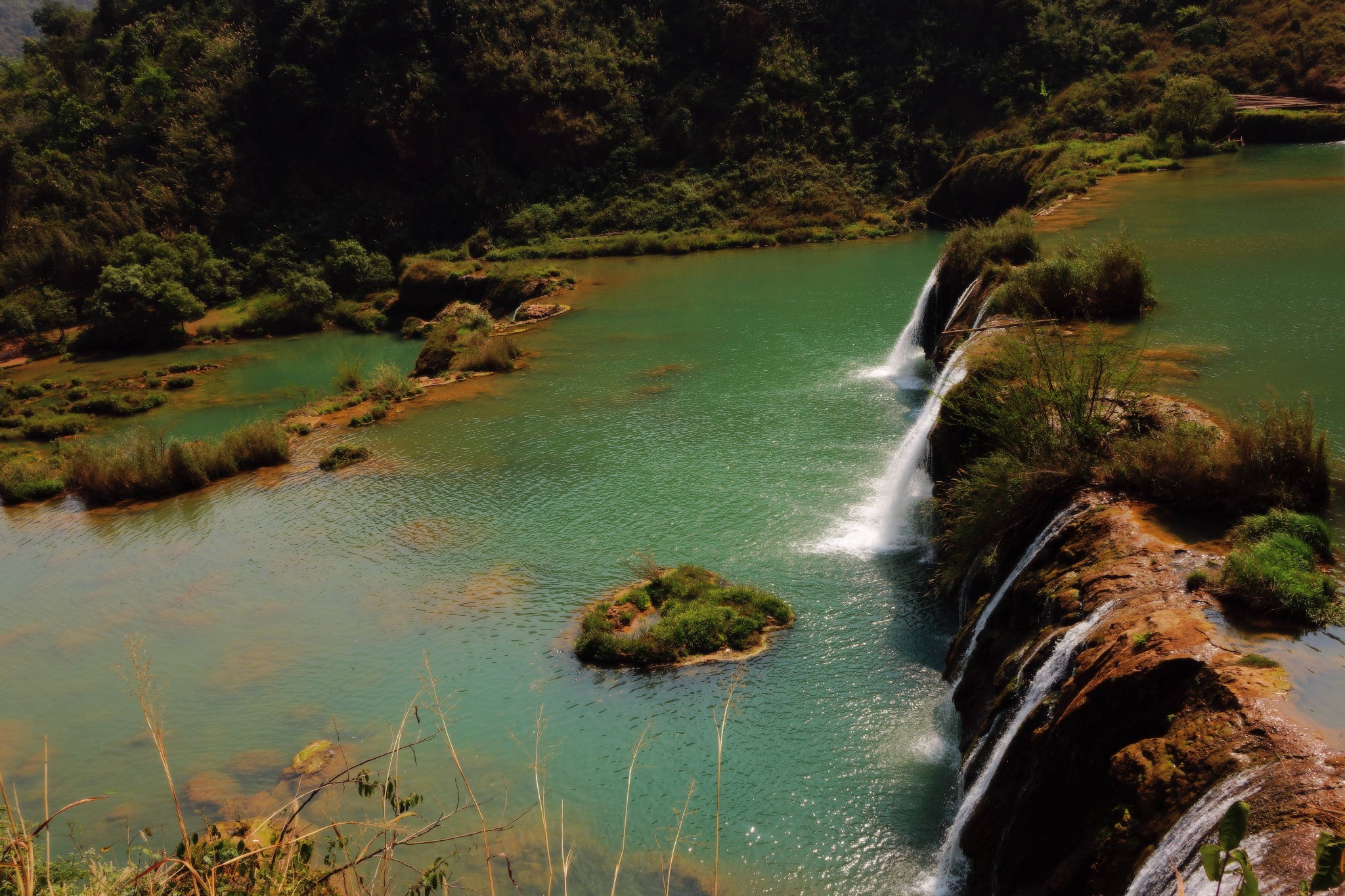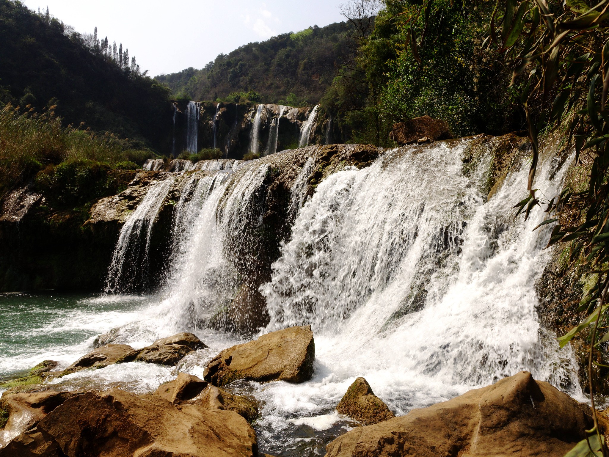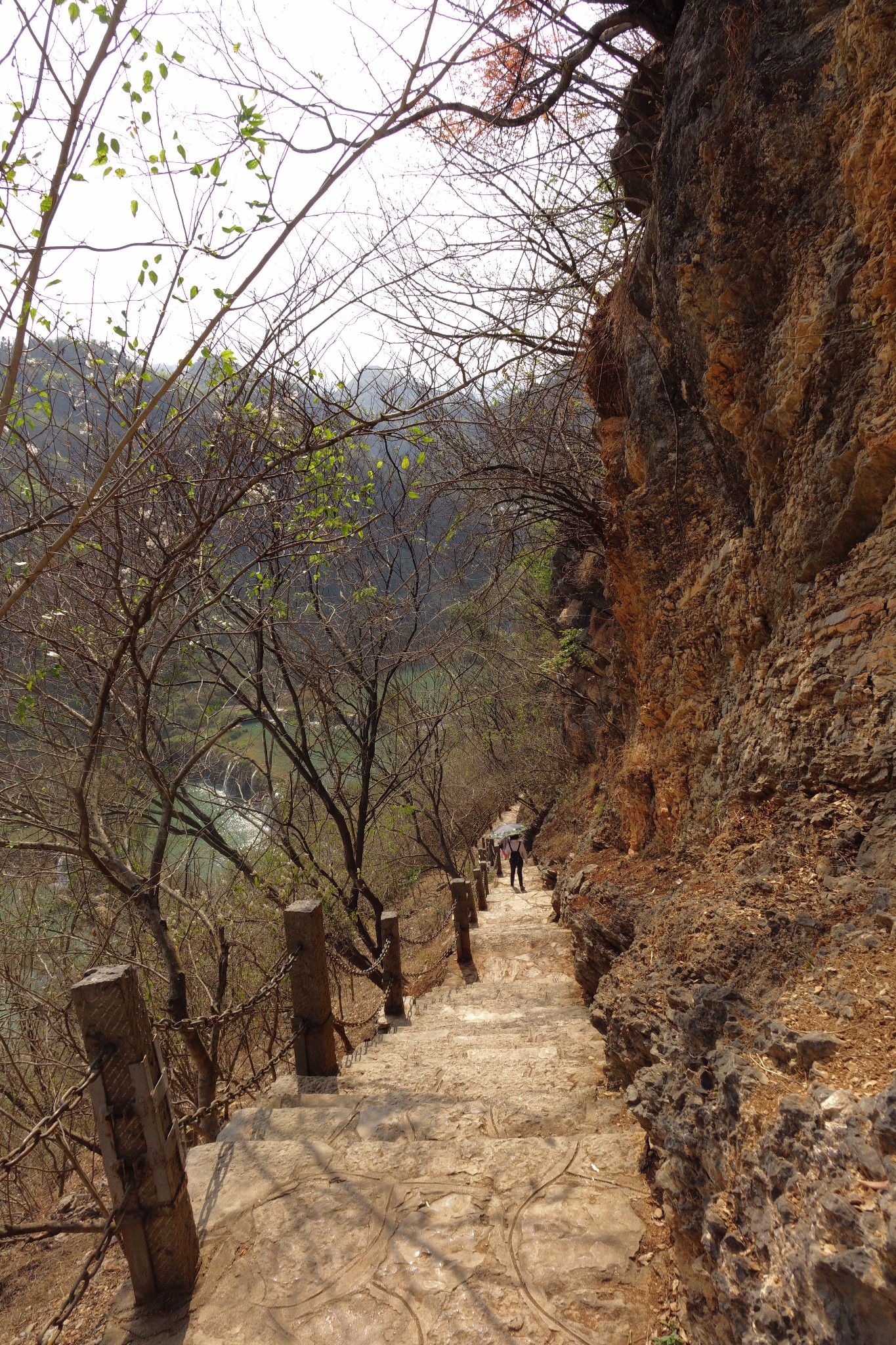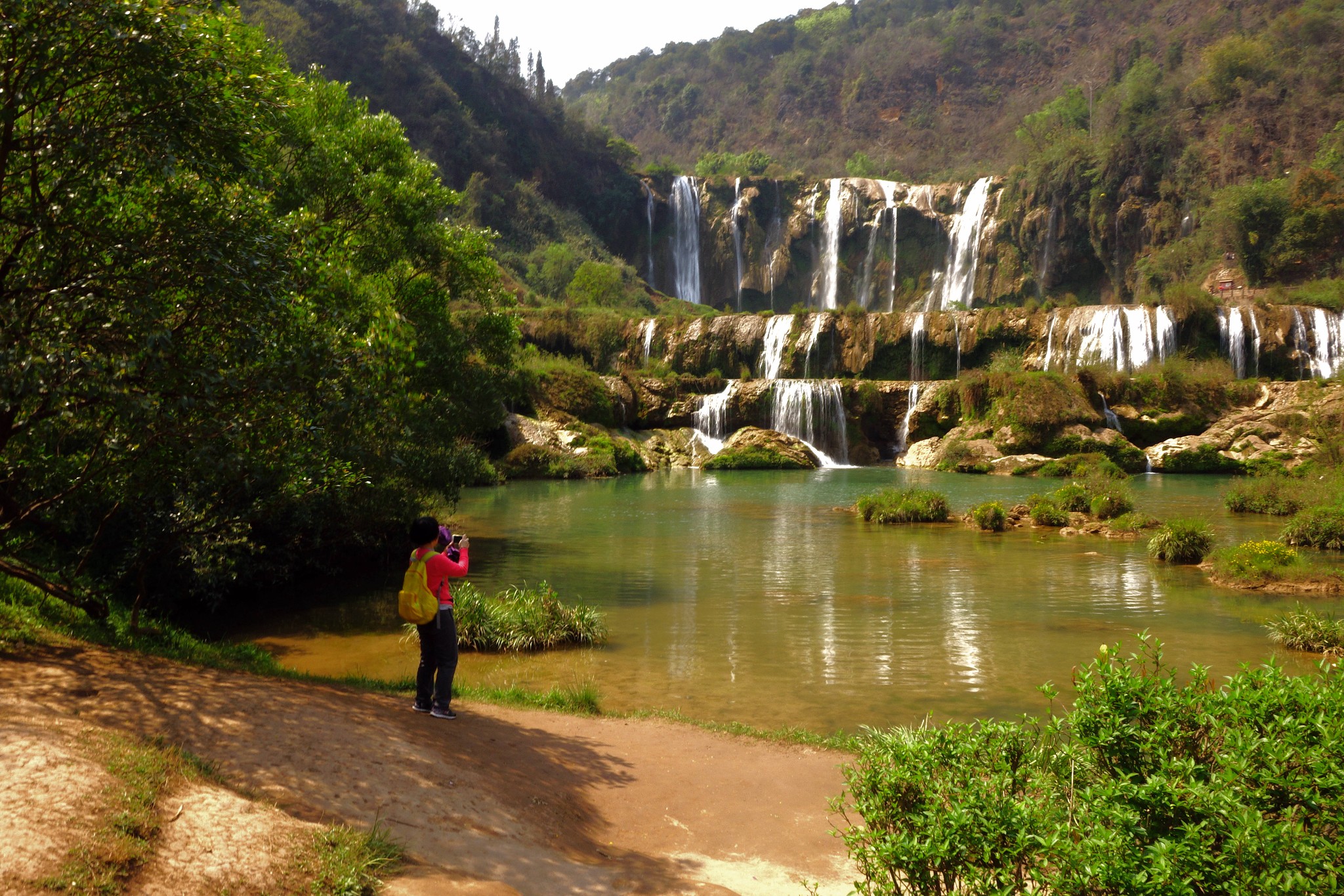 午饭后,先到了九龙瀑布。网上介绍,罗平九龙瀑布群,位于云南省罗平县 城北22公里处。由于特殊的地质构造和水流的千年侵蚀,在此形成了十级高低宽窄不等,形态各异的瀑布群,其中最大的一级宽112米,高56米,气势恢宏,蔚为壮观,号称九龙第一瀑。九龙瀑布群因其瀑布众多,景点密集而形成其独有的观赏特点,一年四季美景不断,素有“九龙十瀑,南国一绝”的美誉。