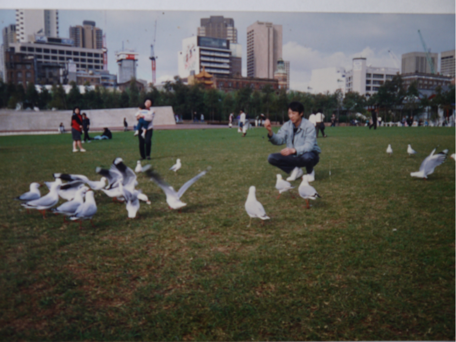 1990年6月,在Darling harbour(/poi/35406.html)附近的草地上喂鸽子。