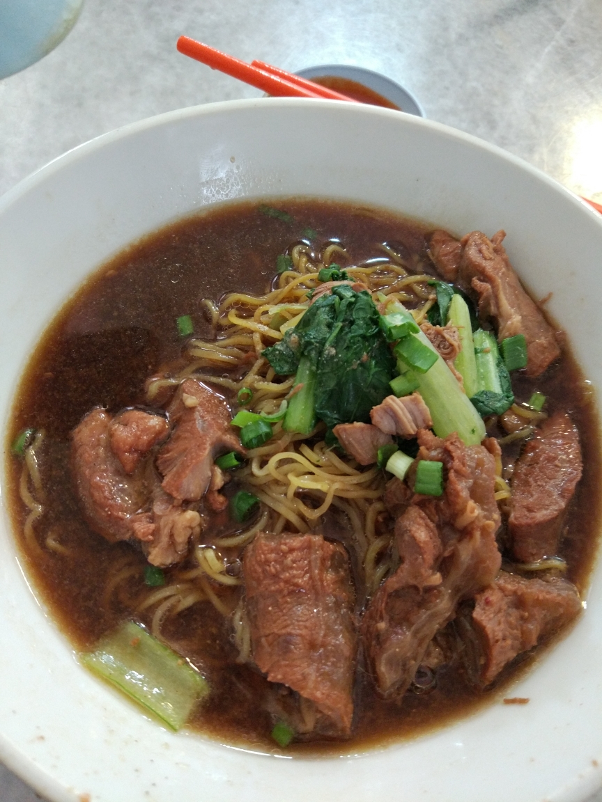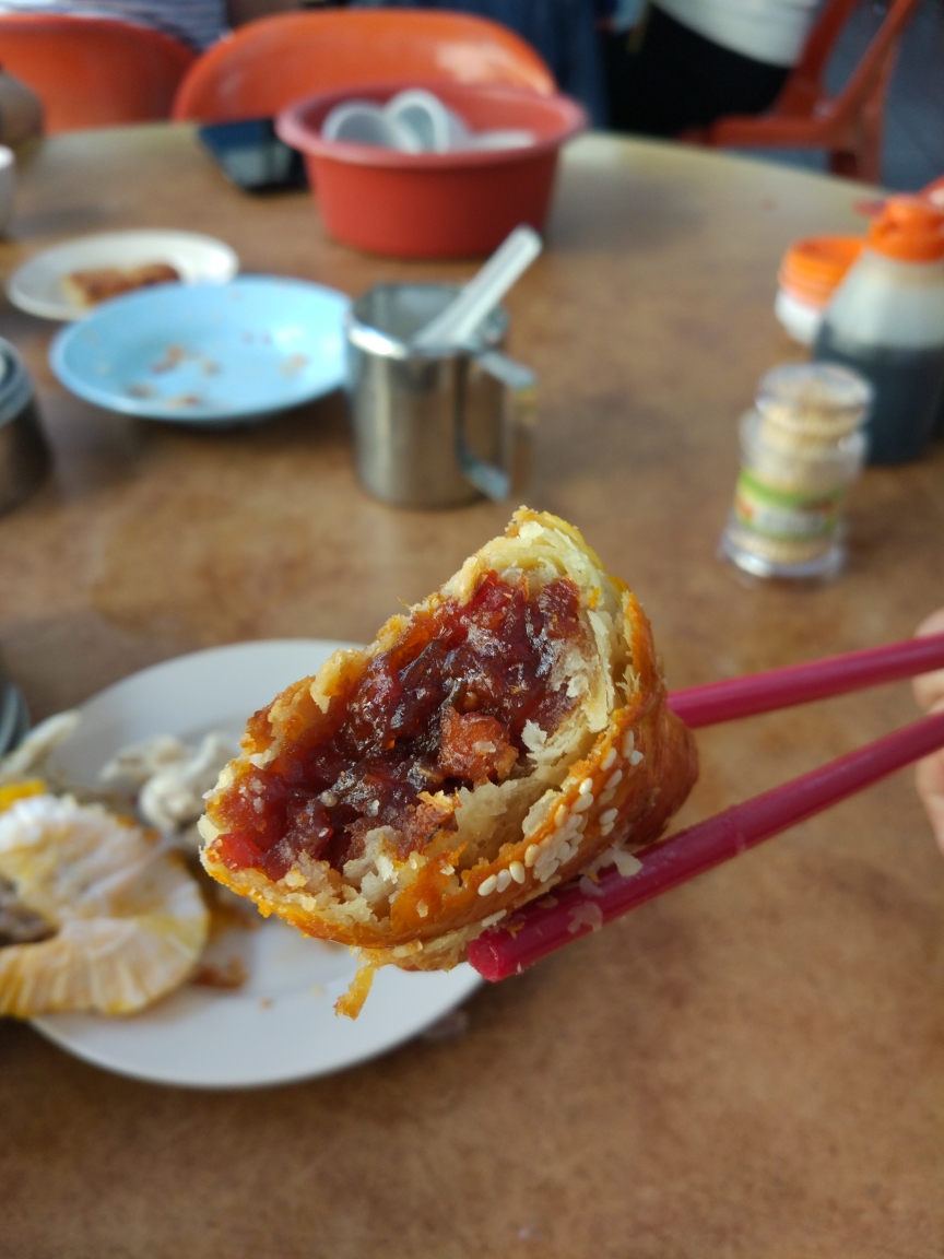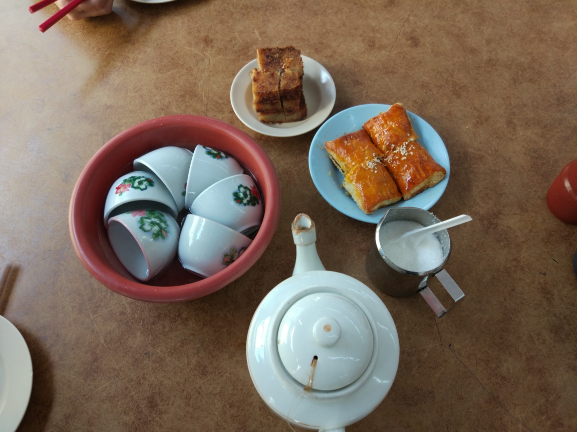 也许是真的累了,一觉睡到9点钟。出门想去楼下院子里的躺椅上坐一会,可往下一看椅子已经被酒店的店宝黑白猫咪给占领了。它慵懒的趴在椅子上正舒舒服服地打盹呢。不忍心打扰它的美梦,我们决定去闻名槟城有着60多年历史的大东酒楼喝早茶。一看到大东酒楼的门面就感觉和广州的点都德,广州酒家,陶陶居和伴溪酒家等比起来弱爆了,有点像街边不起眼的小餐馆。由于我们到的晚,酒楼里的人没有想象中的多。落座后点了壶菊花茶,服务员放了张记帐单在桌子上,在写着菊花茶的小空格里划了一下。至于茶点不用着急,店里有两个推着装满点心包子和蒸菜小推车的白发老奶奶会把小推车推到你桌前,你看着点心想吃什么她们就给你上什么。茶点摆在桌子上后她们会在记账单上做记录,然后再把推车推往下一桌客人。我们点了一份萝卜糕,两份虾饺,一份流沙包,一份叉烧包和一份蒸排骨。不一会我们点的菊花茶也上桌了,一看那茶壶和杯子就像家里放着的民国老茶器。我们各倒了一杯茶水,菊花浓郁的香气马上就扑面而来,喝了一口味道不错,消暑解渴。我左手拿着茶杯右手就去拿了一个金黄色的流沙包,咬了一口包子,有着浓郁奶香和蛋黄味道的流沙就自然地流进了嘴里交融着菊花茶的香甜,这滋味一点都不亚于广州各酒楼的味道。可能是因为没吃早点,又加之点心可口,顿时觉得胃口大开便风卷残云地大吃大喝起来。虾饺的虾很新鲜,萝卜糕质地柔软,叉烧包无敌好吃,蒸排骨也汁多而不腻。唯一遗憾的是她们家的招牌帝王包由于去晚了没吃到。半小时后我带着满足的笑容去结账,我又震惊了,价格只是广州的一半。看来有里子的不一定要注重面子,酒香不怕巷子深啊!喝完早茶后我们继续前行,忽然看到前面围了一大群人,还以为是发生了什么群体事件?结果走近一看人民群众的情绪很稳定,他们只是围在一个商店的门面前等待发放免费的食物。在门面的上方拉着一大块横幅写着拿督斯里 点点点 博士免费分发午餐两百份。原来是在做慈善活动,秉承着内事问百度外事问谷歌的理念谷歌了一下,拿督里斯是马来西亚州苏丹(世袭州长)封赐的最高封衔,原来被林丹打得四处找牙的李宗伟也是拿督里斯。就在这时旁边清真寺的大喇叭响起了召唤穆斯林群众去礼拜的声音。但人群不为所动仍然在静静地等候分发食物,这些人群大多是穿着朴素和年纪较大的人士。这就是马来西亚一到独特的风景线,穆斯林每天要做五次礼拜,在他们做礼拜的时候华人和印度人都在工作挣钱。穆斯林群众是精神生活重于世俗生活而华人和印度人却恰恰相反。这就说明了为什么华人和印度人在商业和小手工业上很成功,因为他们不会每天花那么多时间在宗教信仰上。这也说明了马来西亚是在伊斯兰国家中的一个非常包容的国家,大家在同一片天地下各司其职做着自己认为是对的事情,互相尊重和理解,互不干涉别人的生活。从这一点上也可以理解到为什么马来西亚是马来人至上了,因为马来人都信奉伊斯兰教,都要遵守伊斯兰教的教义和教规,他们需要在神圣和世俗中找到平衡。而非穆斯林们可没有那么多包袱,在别人做礼拜时是他们闷声发大财的好时机。这就会导致不正当竞争,马来人就会认为不公平,局外人会认为马来人很懒,所以为了减少种族间的贫富差距和不满,就需要出台马来人至上的法律了。尽管有一些矛盾摩擦和个别的事件但是马来西亚还没有像印尼一样发生过大规模屠杀华人的事件,也没有出现像一些中东国家强迫你信仰伊斯兰教不然就把你肉体消灭的事件。由于中午炎热为了避免中暑(我们中确实有人中暑了)我们迅速赶到酒店休息。经过两个小时的休息,外面太阳也不是那么辣了,我们决定到获得联合国教科文组织古迹保护奖的蓝屋–张弼士故居看看。张弼士是红顶商人兼大清国驻马来西亚槟城首任领事,也是新加坡总领事,张裕葡萄酒创始人,当时海外华侨中首屈一指的巨富。可能我们与发财无缘错过了游览时间,只能在院子外朝里窥探和拍照。据介绍这是槟城风水最好的宅子,现在宅子的后院是一家保护性开发的酒店,价格不菲。在蓝屋的旁边就是槟城红园美食城了,里面可容纳一千人就餐。里面有本地菜,泰国菜,韩国菜和东北菜等等。我们点了泰国菜和大虾烧烤。这是我第一次吃这么大的虾,虾肉比我的大拇指还大,加上蒜泥的香味极其美味。吃完烧烤我们决定去看看闻名世界的槟城壁画。它们是由来自立陶宛的艺术家和当地画家为庆祝乔治城节(2012)而创作的街头画作。由于这些画分散在老街的许多巷子里,我们只找到了几个有代表性的壁画如姐弟单车,猫捉老鼠,嘿你听见了吗等等。看完壁画感觉又饿了,刚好路过一家餐馆,招牌上写着祖传南洋云吞面和牛腩面。我们就点了云吞面和牛腩面,坐下来之后另外一家卖冷饮的服务员就问我们要喝什么?我看到周围的人都点了一种加冰的褐色饮料,我就示意她要和那些人一样的。由于面要现煮,饮料先端上来了,正好也渴了,就用吸管猛吸了一口,味道酸爽带甜非常消暑。不一会牛腩面和云吞面也上来了,牛腩基本把面给铺满了,我迫不及待地吃了起来,牛腩一半带筋一半带肉松软适度感觉入口即化,云吞皮薄肉厚非常鲜美,面细如粉丝含有大碱很有劲道。这可是我吃过的最好吃的牛腩面了。吃完以后天色已晚,我