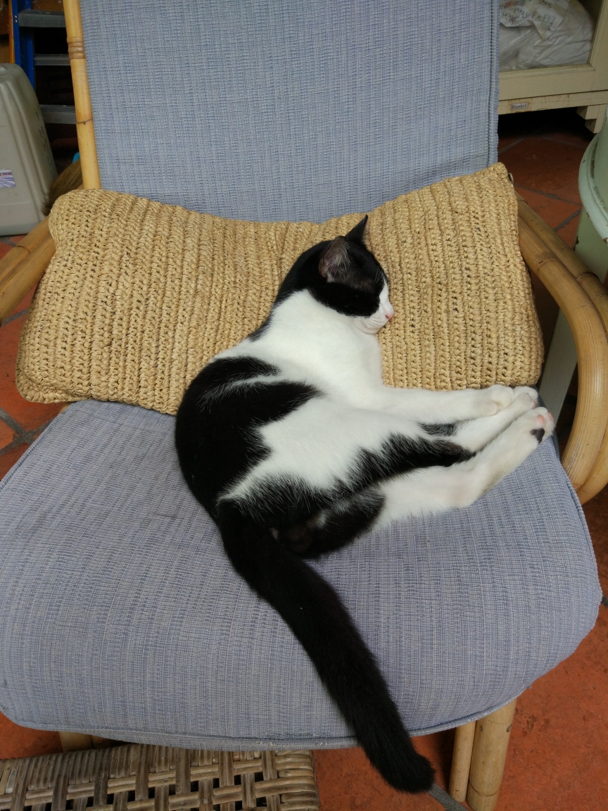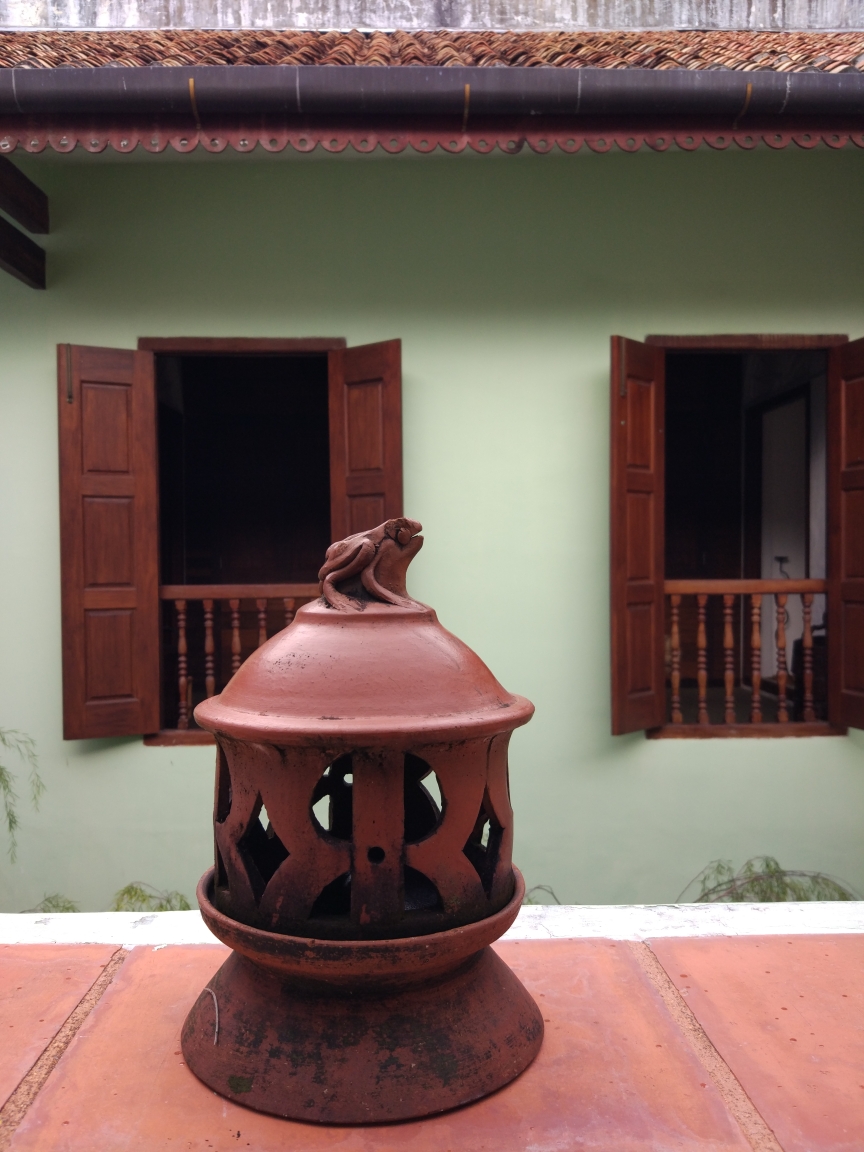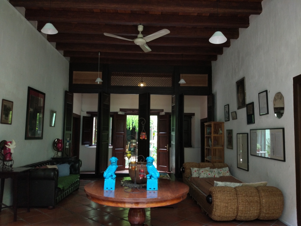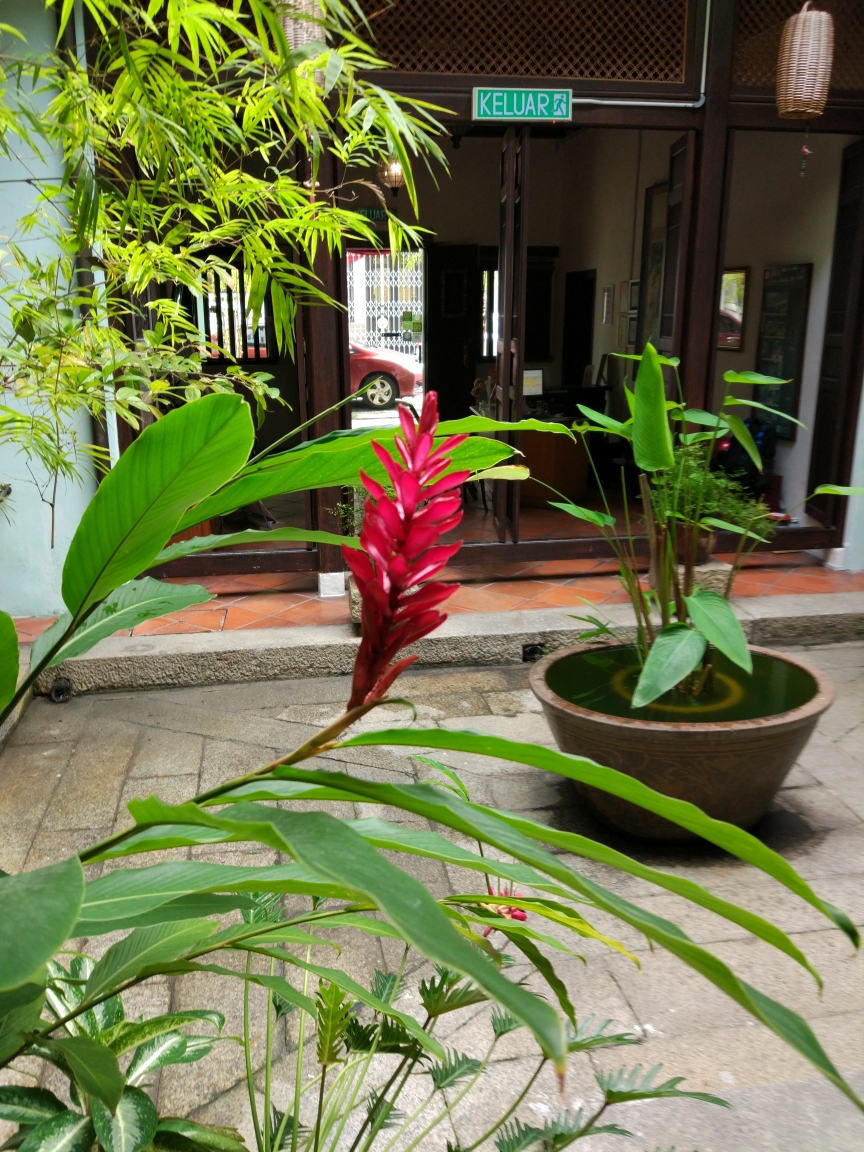 一大早早起,整个房子就我们一家人。去厨房吃了简单的大陆早餐,另外一个司机已经来送我们去机场了。到达机场后拿出自己打印的登机牌顺利地过了安检,找到了登机口。经过一小时的飞行我们到达了槟城国际机场。槟城机场不大,下飞机以后不到5分钟就走到了公交车站。由于是早上11点半,到酒店入住还太早,就决定坐公交到市区。在公交站等了10多分钟都没有车,刚好站台上有个做调度员的印度大叔,我就走过去给他看了google地图上的地址,他说现在交通有点堵塞,再等20分钟就来了。他问我来在哪里,我说中国。他就说”北京”,我说我们来自云南,离北京很远,他恩了一声说”车来了他会通知我的”。二十分钟后车果然来了,他忙指指车让我们上车,我对说了声谢谢,他微笑着说"不客气"。我火热的心才保持了半分钟就被坐在车上的一个印度人给浇灭了。这位三叔坐在后排黄金位置,却把一双黑脚伸到前排的空位上。我们没办法只有坐在他旁边的座位上。原来以为槟城很小,可是坐在车上这么一走,一点都不小。槟城是马来西亚第三大城市,是马来西亚的硅谷和制造业的中心,这就是为什么槟城车多和交通拥堵的原因。槟城有好多道路都是单行道,就这样20公里的路程走走停停绕了1个半小时。这里的公交车下车需要你按铃提醒司机下车,否则有些站是不停的。还好我有谷歌地图导航,我看快到站了就按了一下stop,听到司机的上方铃响了一下,到站后司机就停车开门,我们顺利下车。下车后热浪袭来,顿时闻到了一股咖喱味和听到了声音很大的印度音乐,街上走着熙熙攘攘的印度人,店铺里售卖各种印度商品,阵阵咖喱味和烧烤的油烟从餐馆里飘出和街上的各种印度元素融合在了一起,你顿时会觉得你是在印度而不是马来西亚。我跟着导航走到了酒店的街口,看到了一家人山人海的名叫芭蕉叶饭店是印度餐馆,刚好肚子也饿了,我们就决定品尝一下印度菜。进去以后刚好有张空桌子,我们坐下后一个印度小哥就过来用咖喱英语问我们要吃什么,我问他有什么特色菜,他就向我推荐了芭蕉叶抓饭,咖喱烤鸡和咖喱虾。饭菜是盛在芭蕉叶上的,旁边虽然有勺子和叉子但我看周围的人都用手抓着吃。卫生间门口的洗手池就提供洗手液和卫生纸,洗完手后我们就开始入乡随俗地体验起黏黏糊糊黄黄绿绿的手抓饭。味道棒极了,它颠覆了我对印度食物的看法。吃完午后我们走了五十米就到了我们预订的东印度阁酒店,一听名字肯定以为这是以印度建筑风格为主的酒店,可是一进门却发现是地地道道的中式风格的两进院格局建筑。后来在酒店的文化墙上了解了这座院子有着两百多年的历史了,它的原主人是个华人,后来因为种种原因家业没落了,房子也衰败了,后来槟城成了世界文化遗产小城,一个印度裔老板出资对老房子进行整体修缮,为了进行可持续的保护就把它变成了一家客栈。房子是土木结构,一楼是院子走廊,会客厅和饭厅,院子里种满了奇花异草,院墙边还种了一排排竹子。楼上的六间阁楼就变成了客栈房间,露台和回廊都有沙发和椅子可以休息。由于楼板都是木质结构古色古香,于是老板在墙上贴出了请轻巧走路的告示。办理入住的是一个印度的青年女子,态度很好英语流利,在她写字台的旁边还有一个她的助手–一只干净的黑白相间的猫咪,正懒洋洋地趴在桌子上打盹好不理会我们,好像人世间的一切事情和它无关一样。办完手续后这位女服务员就领我们上楼去我们的房间。我们的房间是会客厅正上方的房间,很大很宽敞,层高很高可以看到顶上的梁柱和瓦片。房间进门左边的墙上是三层书架,上面摆满了各种手工艺品和接受槟城旅游的书籍。房间的正中央是两张床,在床的旁边放了一个锈迹斑斑的铁箱作为床头柜,上面摆着台灯。房间的最里侧是一个5平方米的长方形卫生间,有马桶洗脸池和淋浴设备,卫生间里对着庭院的窗子全部被封死了。卫生间的隔墙角落有两个双人椅子和一个茶几,总体来说房间显得空旷但又很舒适。每个房间有两扇双开门的门板,可以用钥匙反锁。下楼出到外面的大门是一到遥控自动玻璃门,入住时每个房间都配了把钥匙和大门遥控器以方便客人进出。我们在酒店稍作休息,冲了个凉换上了短袖衣服就开始出去探索槟城。