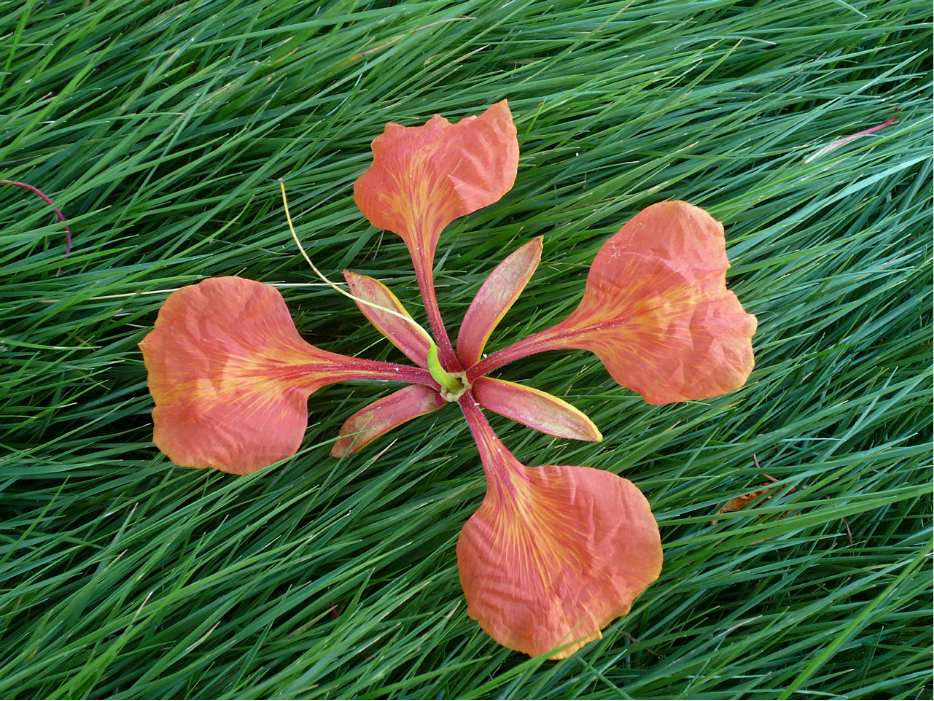 花瓣红色,且带黄晕,下部四瓣平展,长约8cm,第五瓣直立,稍大,