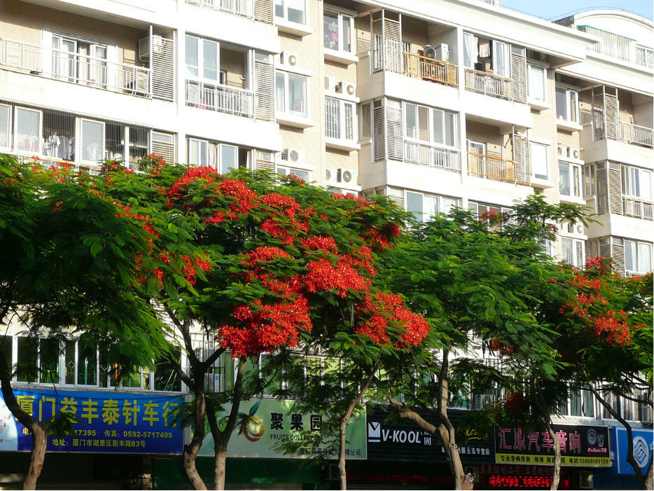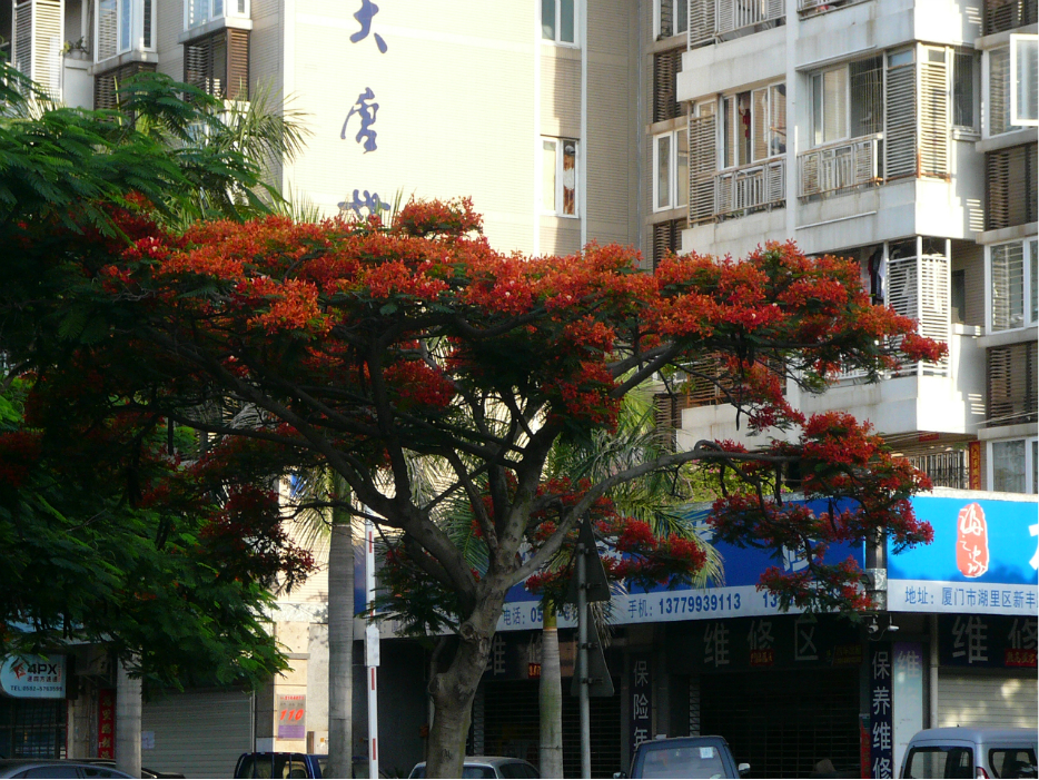 上世纪二三十年代,由厦门 华侨引进种植,厦门 市现有凤凰 木2600余株,为厦门 市的市花,每年5月中旬到7月是凤凰 木的开花期,此时的厦门 街道上绿树红花,相映成趣,岂不美哉!