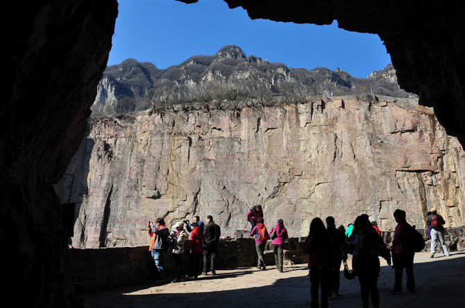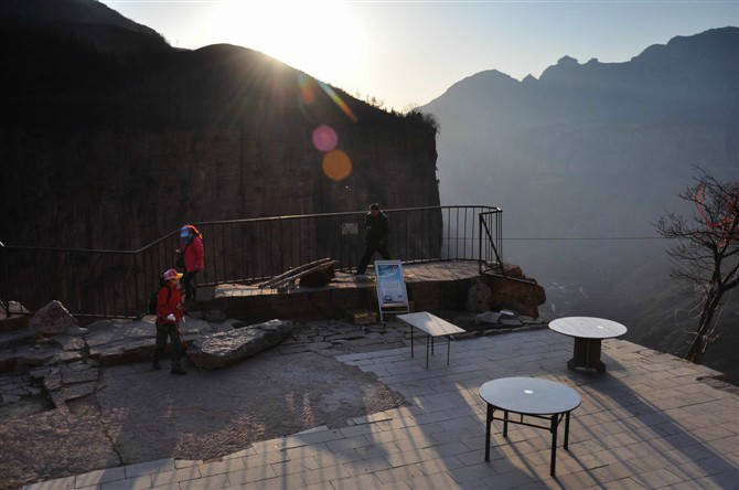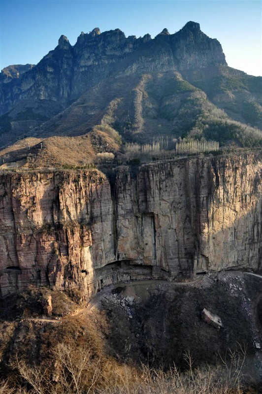 郭亮人在悬崖峭壁上上演了一出现代版的“愚公移山”---1972年开始,全村抽调13个劳力要在千仞绝壁上打个洞,以便修建一条通向外面的公路。(工程期间始终确保13人,12人打洞修路,一人送水做饭),前后五年时间里,郭亮村先后卖掉2000多只羊,砍掉了所有的大树锯成木板背下山换钱,派劳力外出打零工挣钱,集资花费38万元修通了1200多米长、宽5米的遂洞,公路通向了外面的世界。工程期间三十岁的生产队长王怀堂献出了生命,当时他要把凿出来的大石头推下山崖,不想用力过猛,他也跟着石头摔下去。两天后才找到尸体,村里人为他守灵三天后,一个月后山里又响起了叮叮当当的凿石声。