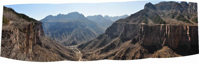 万仙山的山势陡峭,应该和川藏线的横断山是一类的吧!(本以为是沉积岩,但是国家地理杂志上说是花岗岩,花岗岩应该属于火成岩。)仿佛大自然把山硬生生的从中间撕开一样,所见山峰都是万丈之高,垂直上下,山面均为石头,所生植物极少,只有山顶稍平的地方有丛丛植被,所以层层山峦非常的有层次感,就像一幅幅美丽的中国水墨山水画。难怪是很多画院学生的写生基地!路上遇到两位从广东来的学生到此写生,这么远的跑到这个大山里来,也说明万仙山很有魅力!