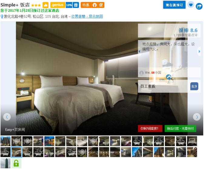 推荐理由:距离小巨蛋步行10分钟左右,靠近捷运站,酒店在一个巷子里面,很安静,但是隔一条马路就是太平洋sogo等购物集中的地方,无论是玩儿、购物、出行,都非常方便。酒店有自助早餐,品质不错!房间新,卫生过关,价钱适中,性价比超级高!去了这么多次台北,只有这家是我会推荐大家去的地方。