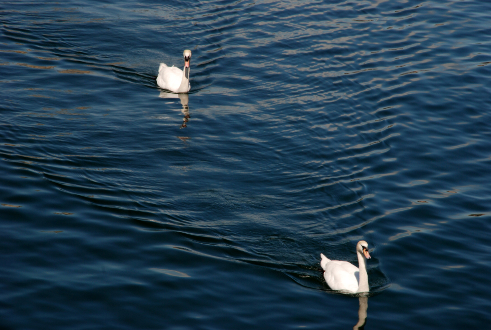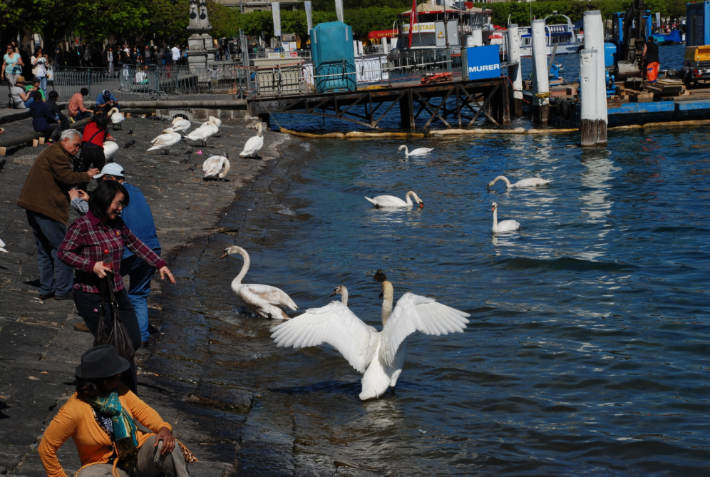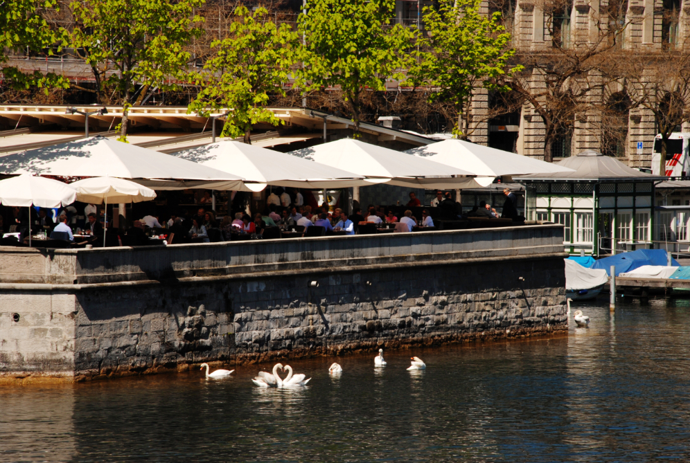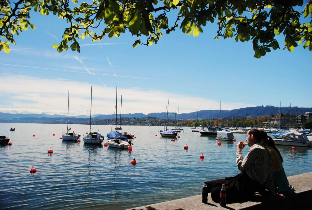 苏黎世湖 畔,情侣在享受正午的暖阳