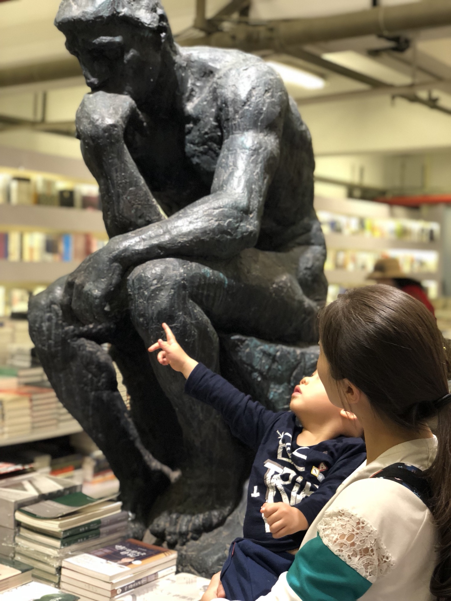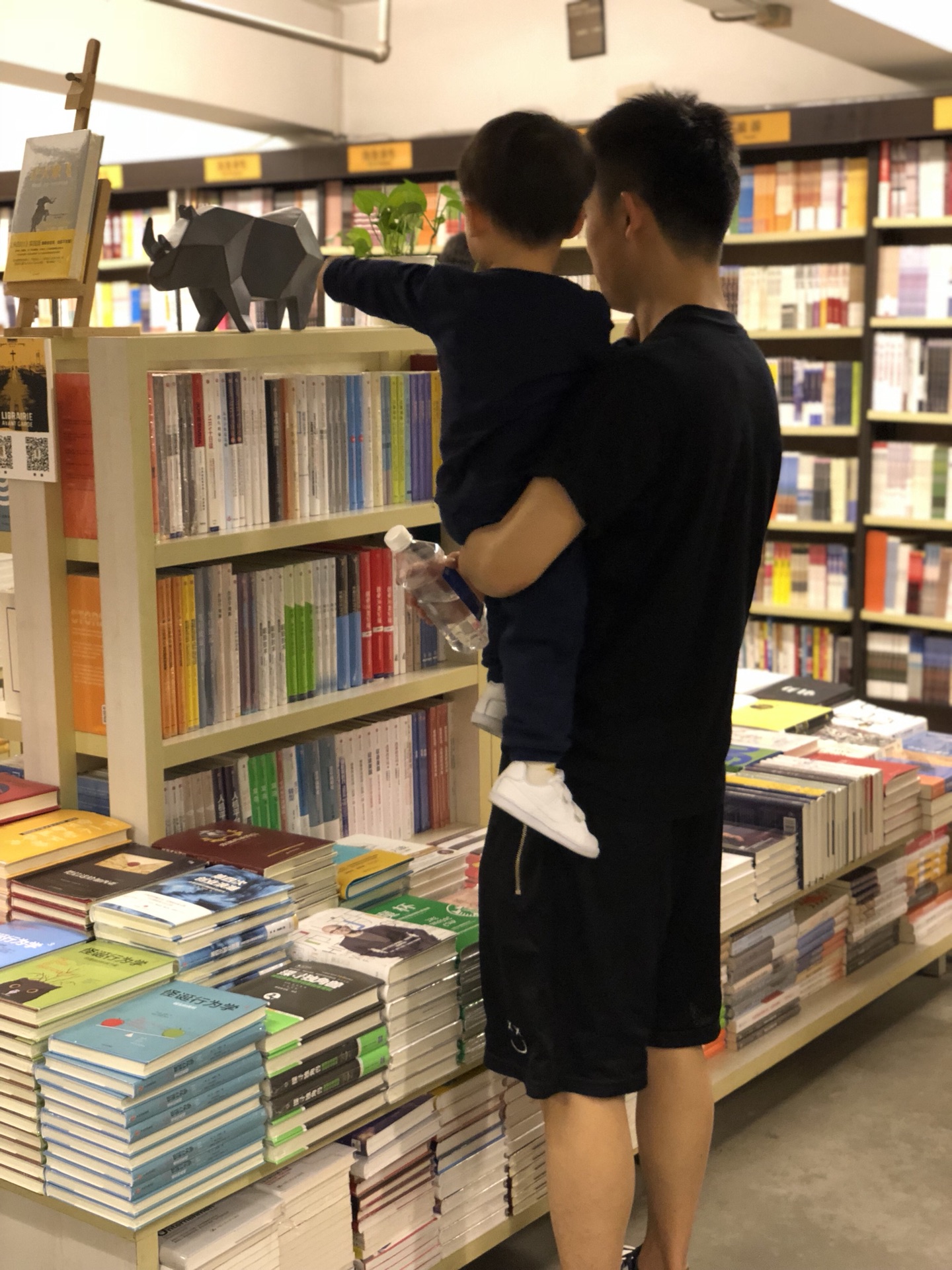 这个分店并没有少儿读物,所以停留片刻就匆匆离去了。但无法抑制我对这个书店的喜爱,在一个现代感的充盈着暖色灯光的空间里,来来往往的读者,有孑然一身坐在书柜旁安静阅读的老者,有三两个聚在一起挑选周边小物的姑娘,有围坐在黑色大方桌边泡一盏茶的青年,整个氛围恬静而安详,让人很想融进去做一枚书虫。我的梦想是不是要改成开书店了?