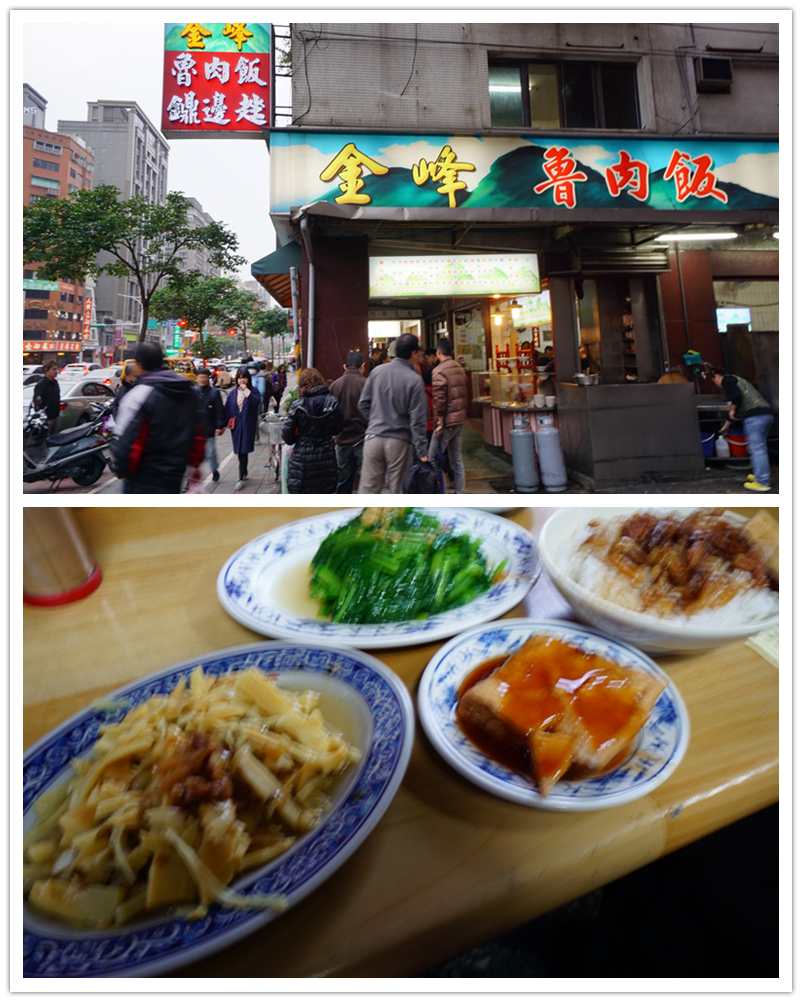 “金峰卤肉饭”是开在路边的小馆子,走得是非常平民的路线。我们在晚餐时间到达,还少少地排了一会儿队才有位置坐。环顾一下四周,来吃的都是本地人,看模样也都是工薪阶层。我们桌旁边就是一家典型的台湾家庭,父母带着小孩点了几个菜做晚饭,回去就不用烧饭了。