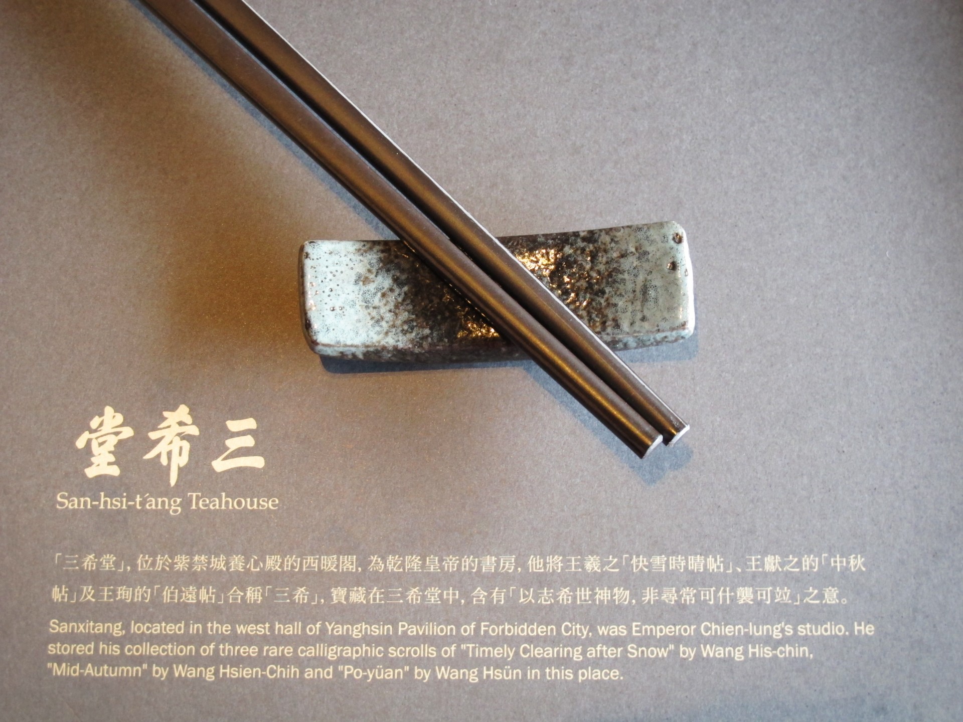 “三希堂”是台北故宫里面的一个餐厅,位于第一展区4楼,提供仿古菜肴、精致茶点和面点熟食,是参观完故宫博物院后一个休息和补充能量的好地方。我一般都会安排一天的时间泡在博物馆里面,所以一般午饭就在里面的餐厅解决。三希堂是诸多餐厅中,和博物馆本身气质结合地比较好的一家,环境优雅,餐具古朴,餐点价格适中。周六还有古筝现场伴奏,为就餐增添了雅致的气氛。