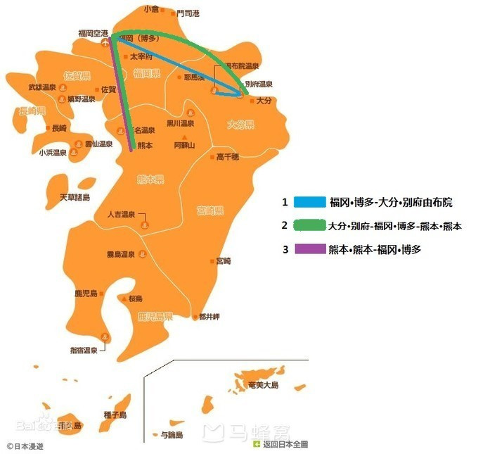 ),然后结合自己想去的和马友们推荐的,我们这次的九州之行主要分为3条线路,如下图: