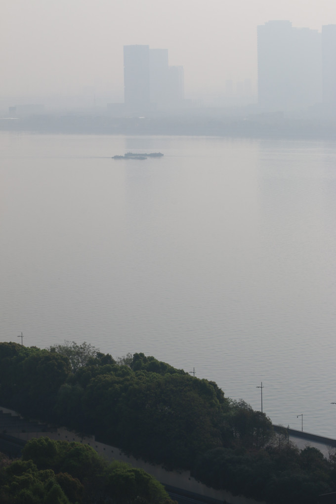 2018年五月初,初夏的钱塘江两岸薄雾熹微, 阳光播撒在绿草道路上的样子斑驳可人。