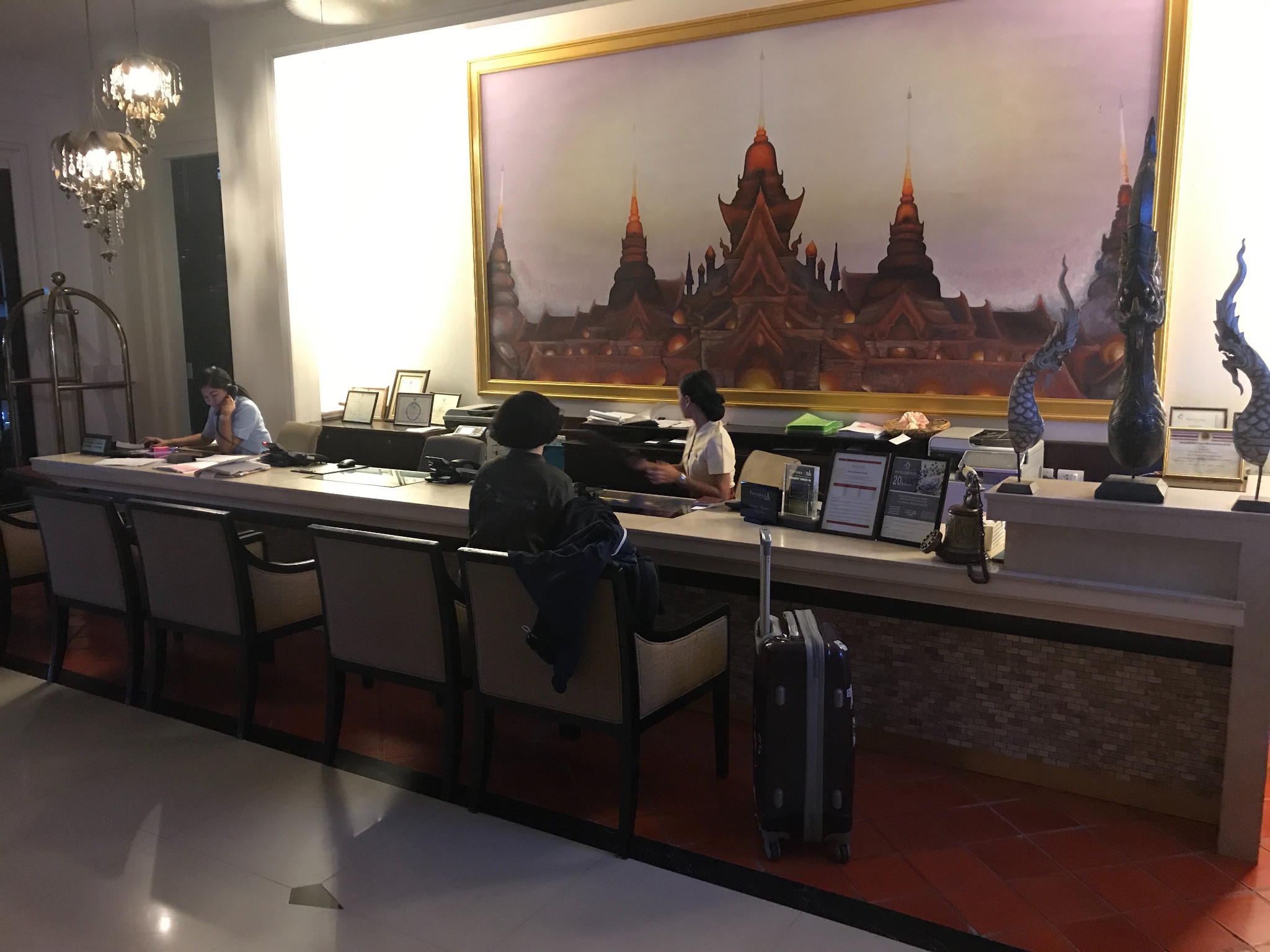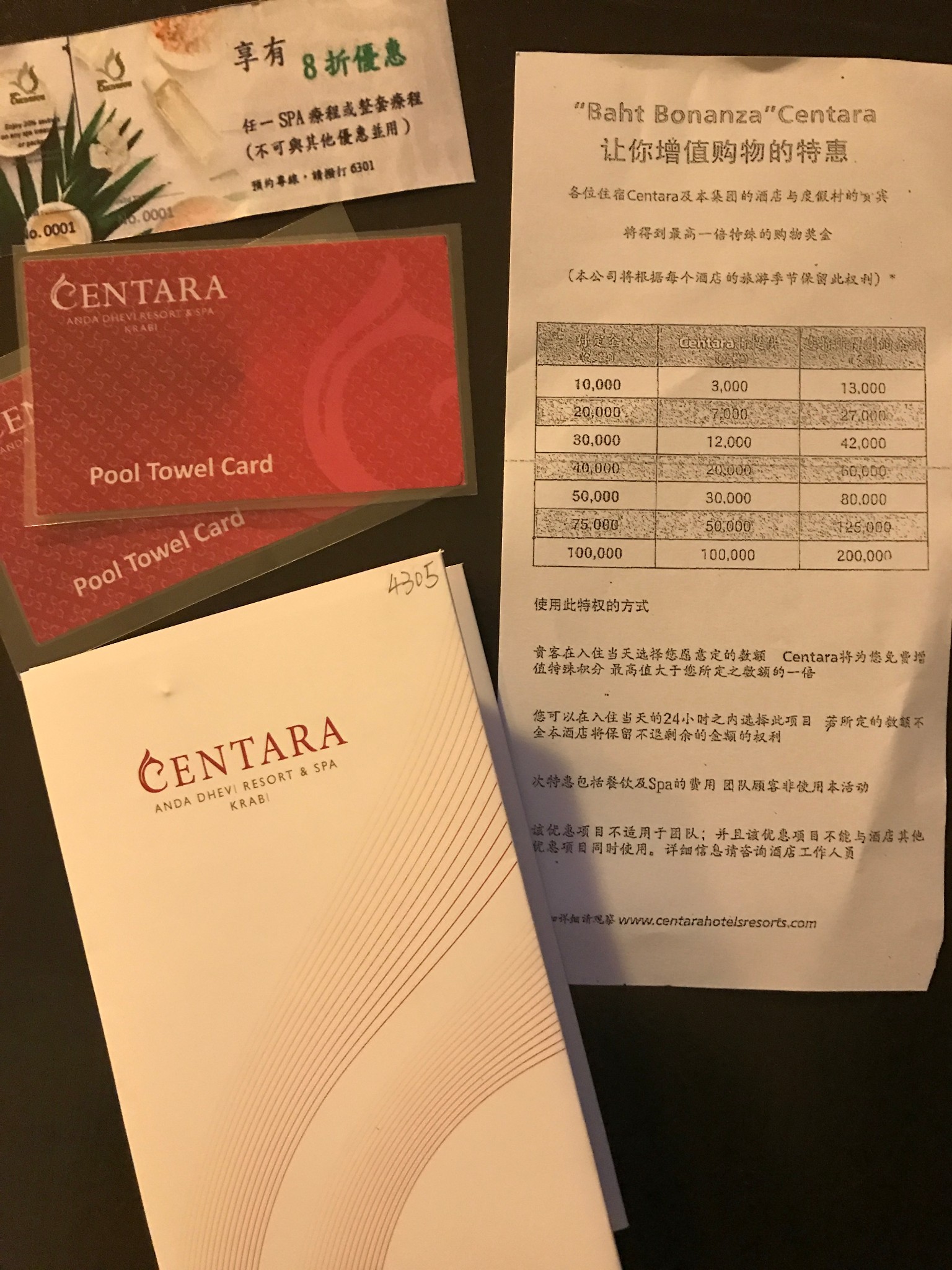 办理入住,该酒店无中文服务员,把旅行社给我的酒店订单交给前台小姐,很快登记完毕,复印完护照后跟我要酒店押金,额?300美金,额?只收美金或泰铢,或者信用卡预授权。我的卡已经拿出来了,突然脑子里反应了一下,我记得旅行社说过已经付过全款不需要交押金的,两个前台小姐呱啦呱啦研究了一下,押金就不收了。又送了一堆优惠券、游泳卡之类逐一讲解之后送我们去房间。我们将在这里连住四晚。