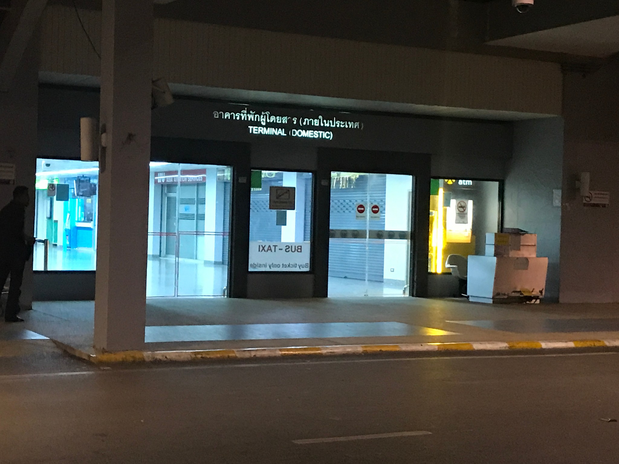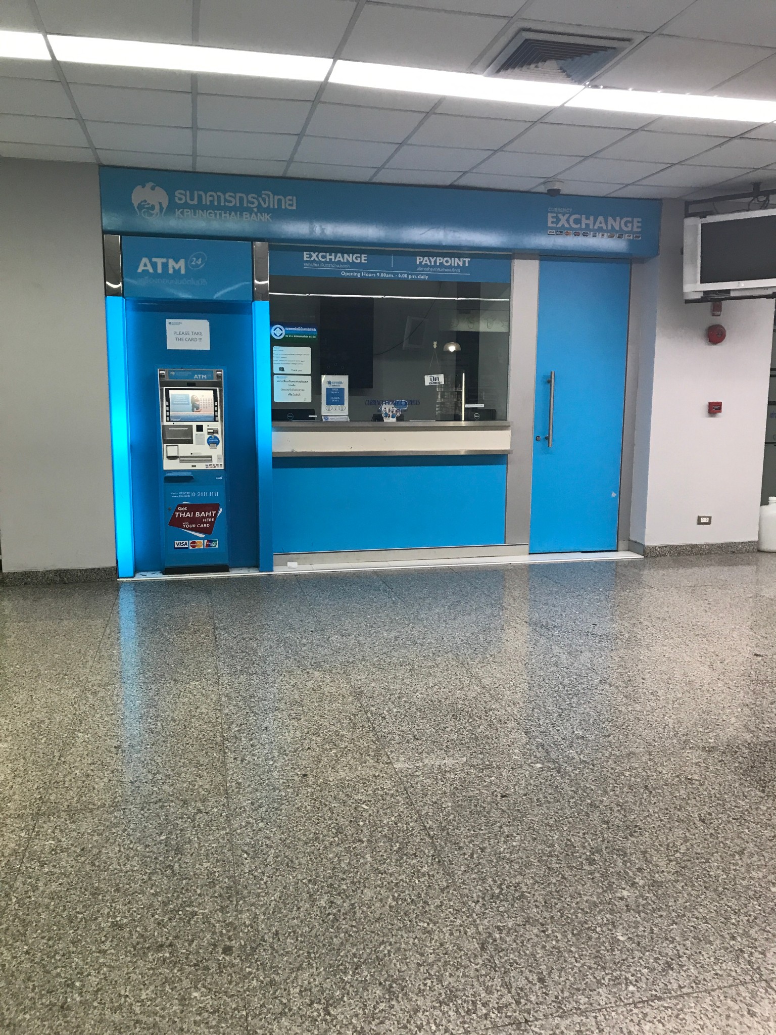 空荡荡的走廊里只有两台提款机,一个黄色的一个蓝色的,这个蓝色的是换汇店的,这个时间换币窗口早已没人,在甲米基本上这样的兑换店换人民币都是4.73左右,最高一家在我们酒店附近的是4.9,而我当日取款的汇率为4.95。其实我是想找紫色的提款机啦,因为紫色的手续费最低呀,只要100铢,而其他这些颜色的都要150铢一笔(2018年最新规定:华夏银行白金卡跨境取款每月免2笔跨境手续费