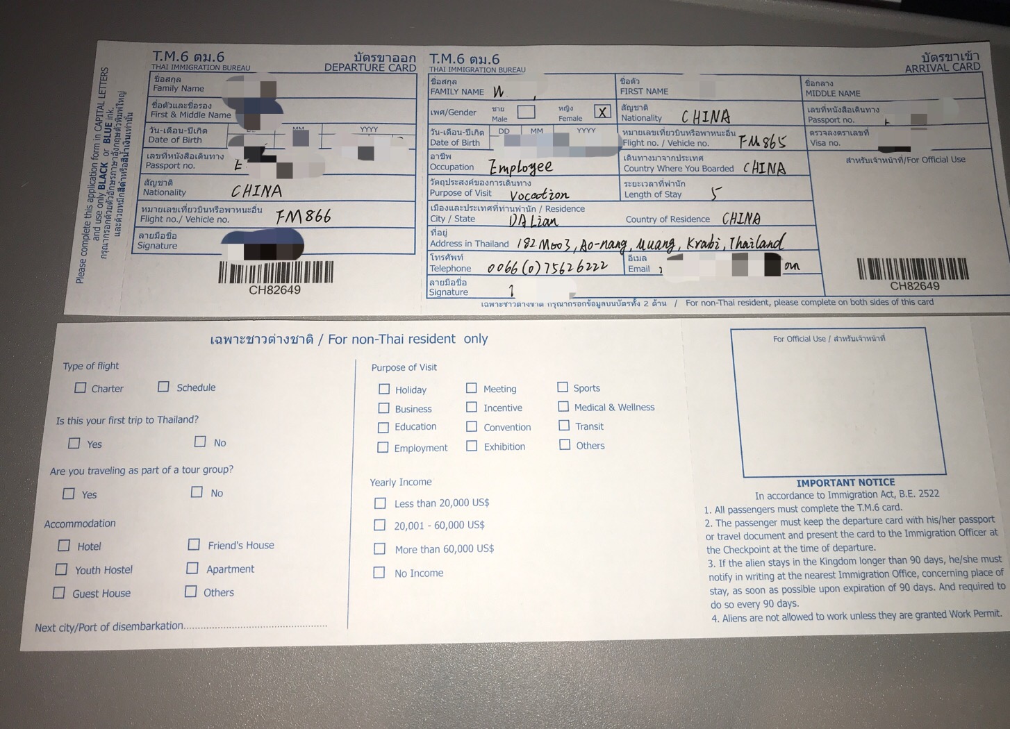 出入境表格,入境后只剩下一小块出境表,必须保管好,丢了就罚款100人民币↑