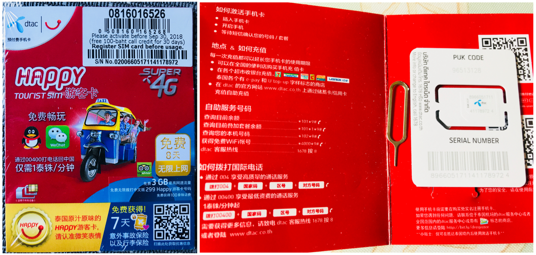 happy卡,可上网可打电话可充值,插卡即用,含7天不限量上网及100泰铢电话费,国际长途按00400+86+国内电话号码,一分钟1泰铢,打电话超级便宜哦↑