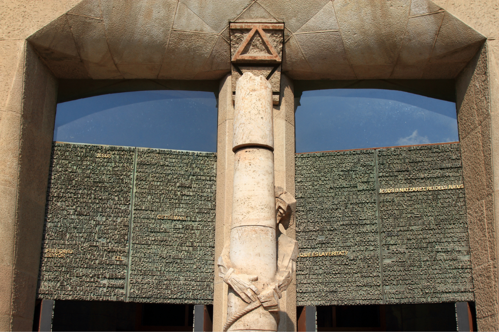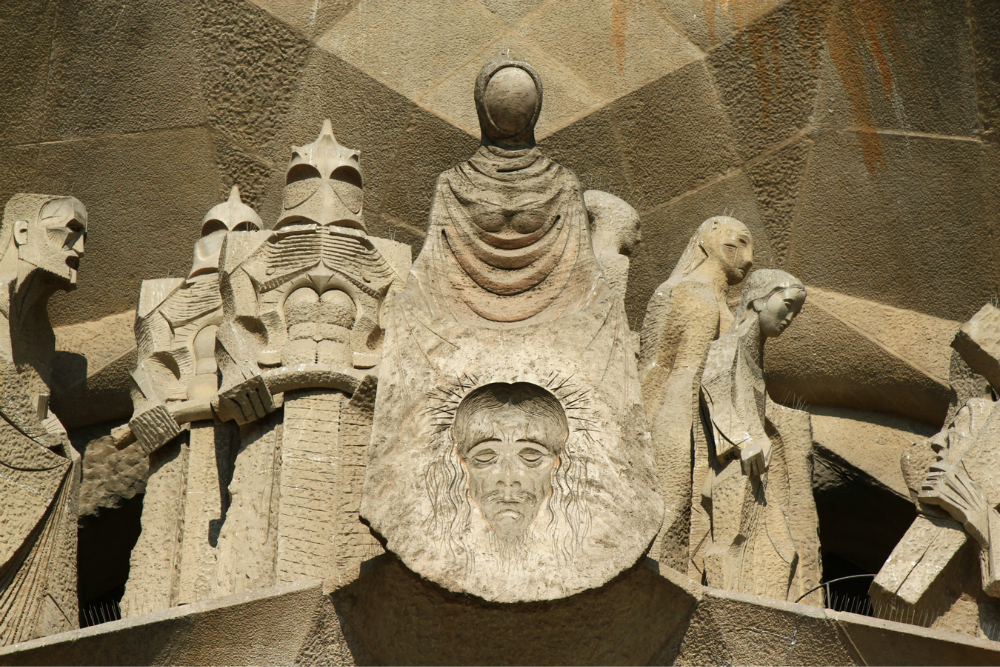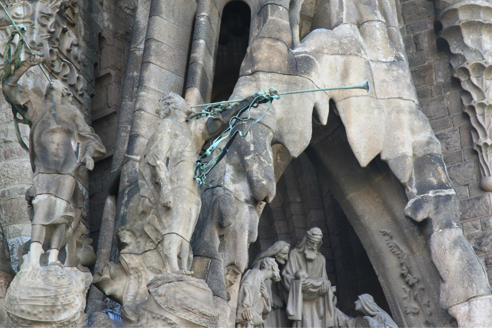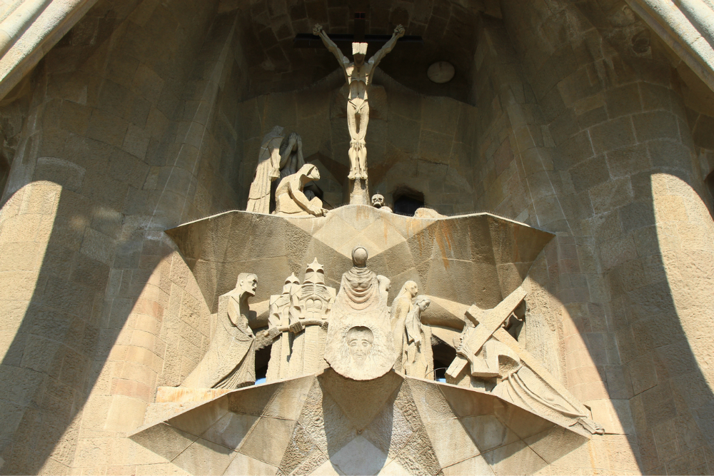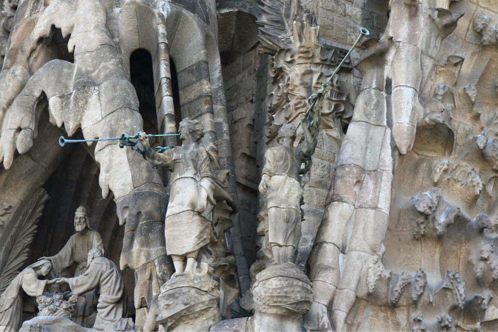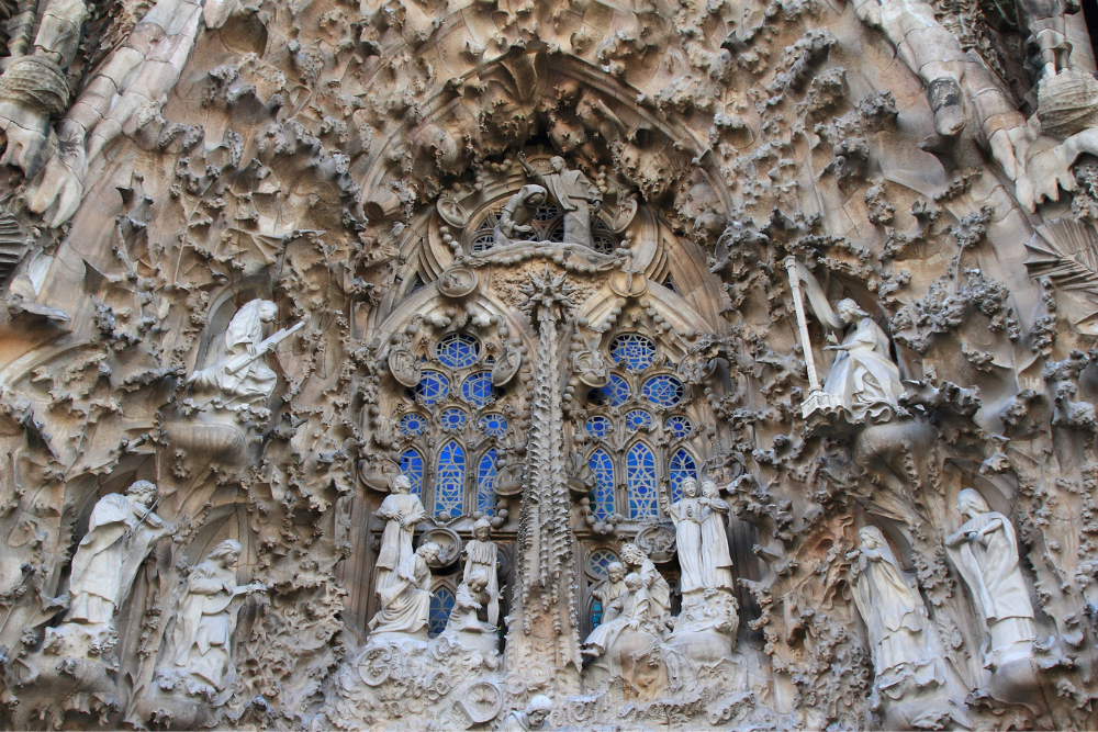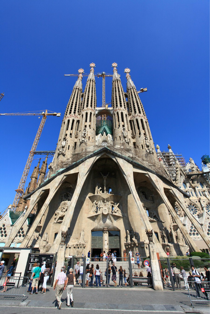 教堂东、西、南侧的“诞生立面”(Facana del Naixement)、“复活立面”(Facana de la Passio)、“荣耀立面”(Facana de la Gloria);描述基督降生 的“诞生立面”出自高迪之手 ,连同北面后龛的墙壁于1912年完成;描写耶稣与十二门徒最后晚餐的“复活立面”,线条简洁的巨大雕塑则是约瑟夫·萨巴拉 奇斯(Josep M. Subirachs)於1990年完成的作品,耶稣赴场一景中的士兵形像,是参考米拉之家屋顶的雕塑所创。高迪将“诞生立面”安排在教堂东方,自有其喻义;每早由东方升起的太阳照耀著“诞生立面”,代表著生生不息的奇迹。由于高迪的建筑设计图曾毁于火灾,后续建筑困难重重,根据保守估计,圣家堂还需要200年的时间才能完工。这一天会不会到来甚至还是个未知数,不过巴塞罗那 人仍骄傲视之,满心期待21世纪即将完成的“荣耀立面”;圣家堂深获民心的昂然丰彩 ,非得亲眼一睹,无以领受深刻的悸动。