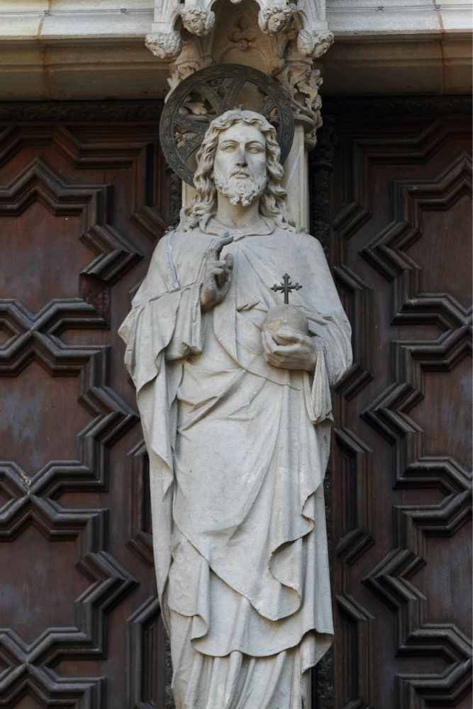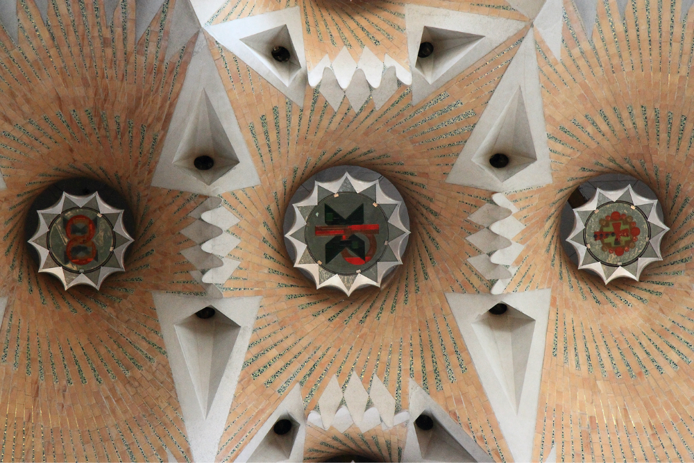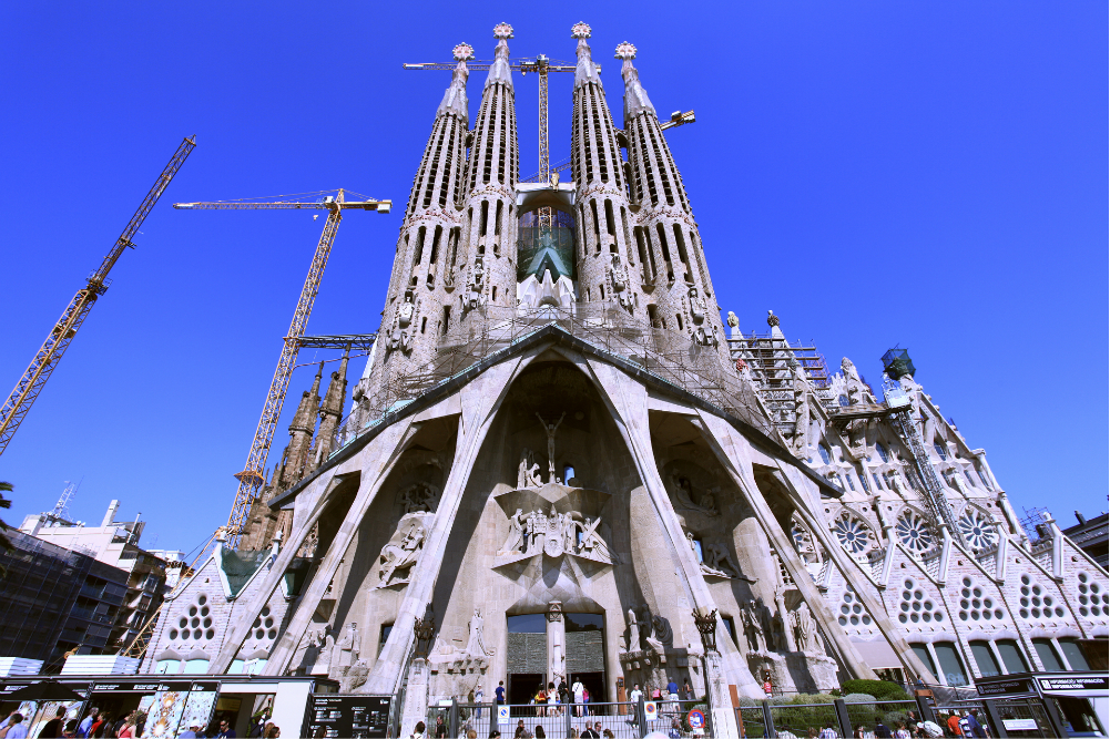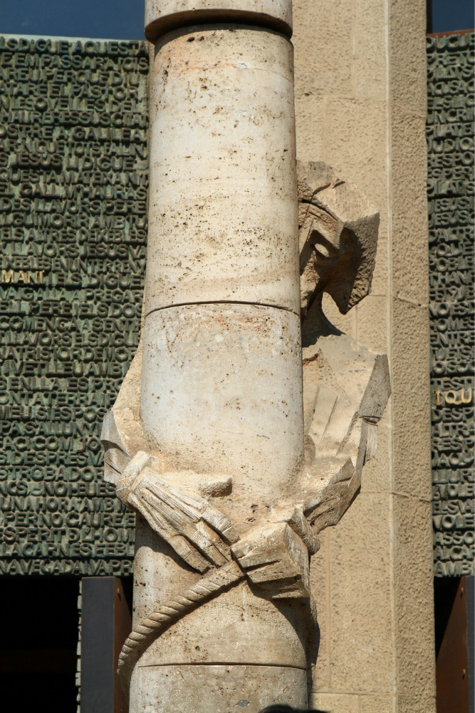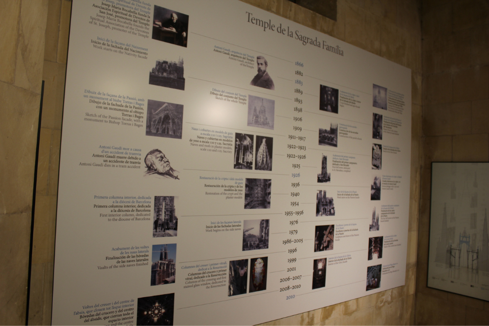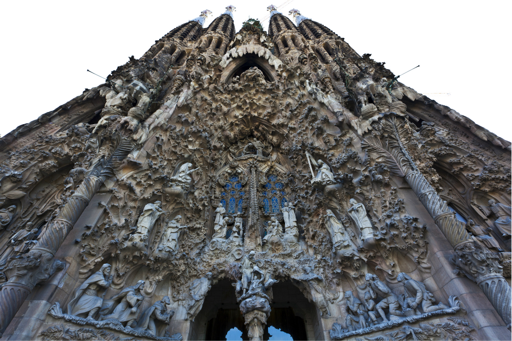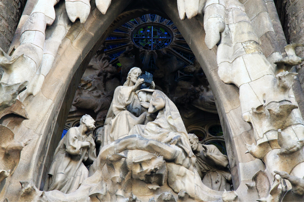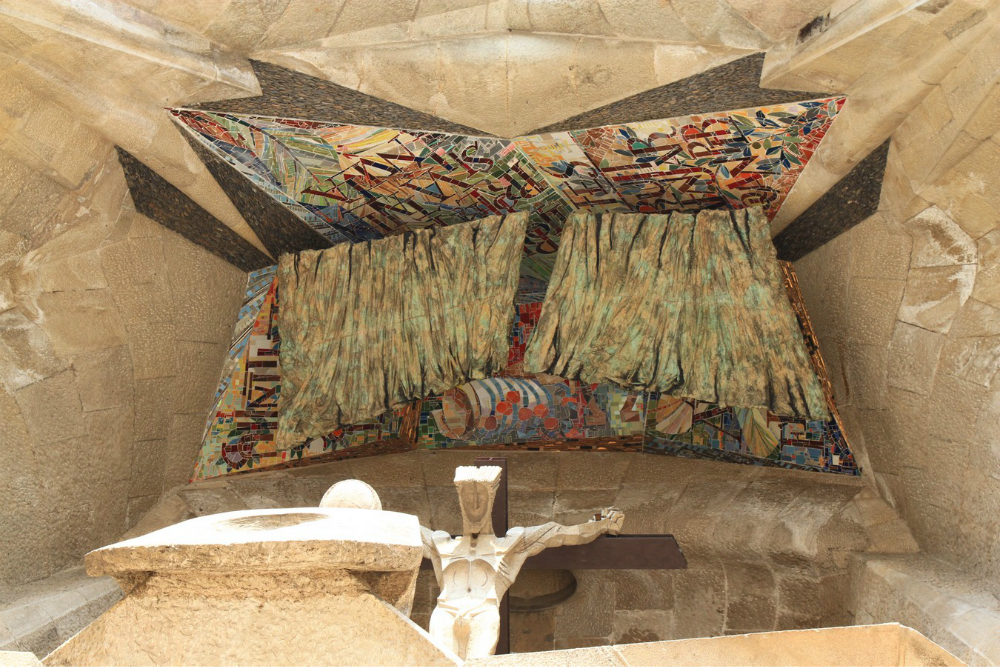 教堂东、西、南侧的“诞生立面”(Facana del Naixement)、“复活立面”(Facana de la Passio)、“荣耀立面”(Facana de la Gloria);描述基督降生 的“诞生立面”出自高迪之手 ,连同北面后龛的墙壁于1912年完成;描写耶稣与十二门徒最后晚餐的“复活立面”,线条简洁的巨大雕塑则是约瑟夫·萨巴拉 奇斯(Josep M. Subirachs)於1990年完成的作品,耶稣赴场一景中的士兵形像,是参考米拉之家屋顶的雕塑所创。高迪将“诞生立面”安排在教堂东方,自有其喻义;每早由东方升起的太阳照耀著“诞生立面”,代表著生生不息的奇迹。由于高迪的建筑设计图曾毁于火灾,后续建筑困难重重,根据保守估计,圣家堂还需要200年的时间才能完工。这一天会不会到来甚至还是个未知数,不过巴塞罗那 人仍骄傲视之,满心期待21世纪即将完成的“荣耀立面”;圣家堂深获民心的昂然丰彩 ,非得亲眼一睹,无以领受深刻的悸动。
