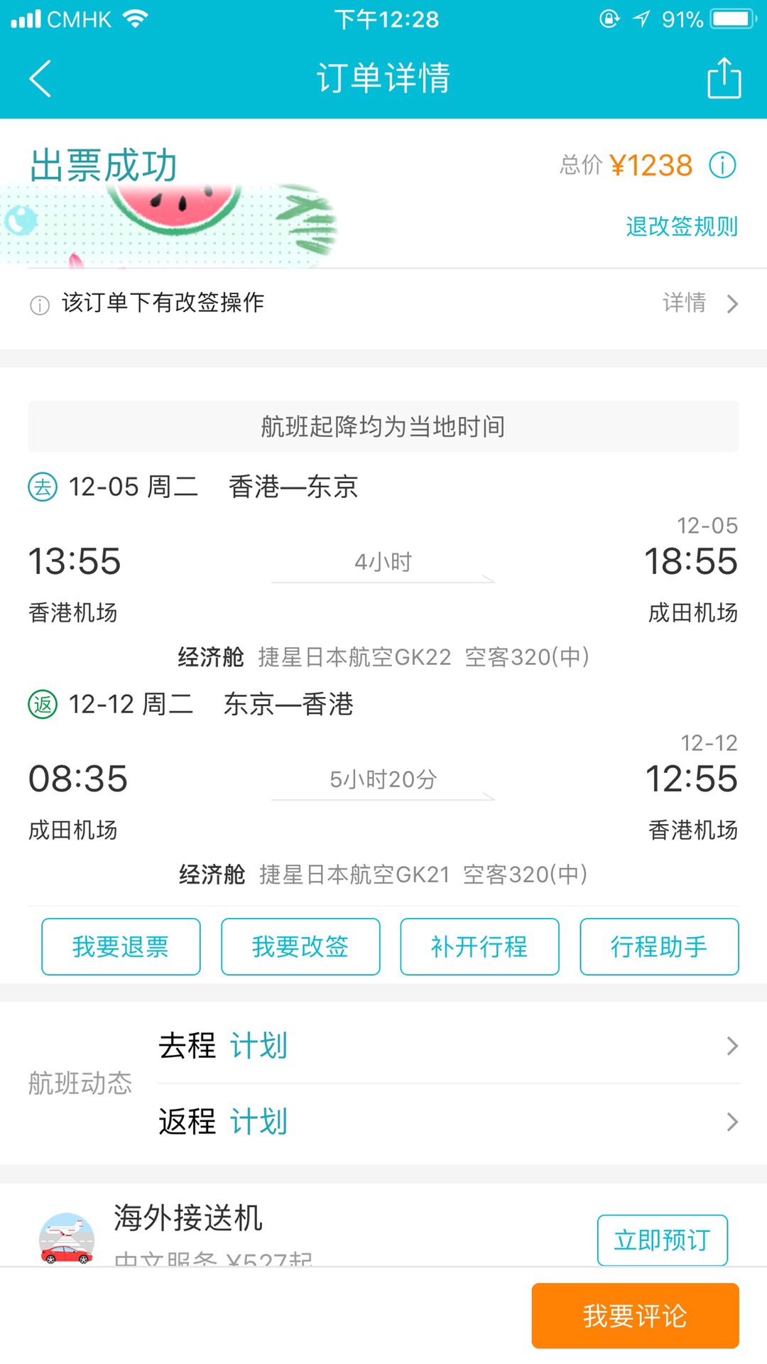 对了,因为时间关系,我们改签了日期,出发日期变为2017年12月8日;回程日期为2017年12月15日。