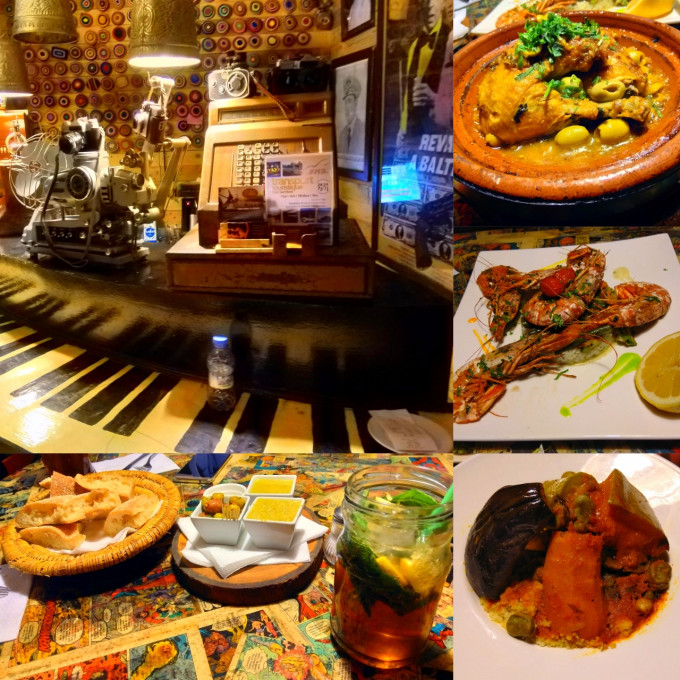 终于可以吃上第一顿安稳饭了,选了一家貌似电影主题的餐馆,但地点名字已经记不清了(其实即使告诉你名字,在摩洛哥的Medina里也很难找到)。餐馆的墙上贴满了各个年代的电影海报,屋顶挂满陶瓷艺术品,柜台摆放着老旧的电影放映机零部件,小吧台还有乐手弹唱……既有时代的怀旧感,又有现代的艺术感。餐馆的环境和服务很是不错,当服务员送上摩洛哥特有的薄荷茶,我已经垂涎欲滴,准备好好的撮一顿。