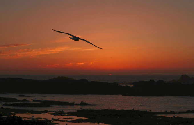 海鸥逐渐多了起来,有的在天空飞来飞去的嘶叫着,有的在海滩跳来跳去的捕着食,也有的在堤坝上踱来踱去张望着。这里的海鸥多的时候让人惊疑,而且是不怕人的,只要你不去惊吓它们,很愿意接近人们。