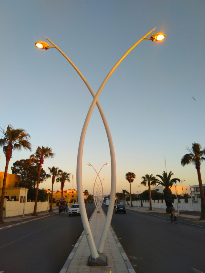 不一样的城市风格让人感到新奇,当你真正的进入到摩洛哥时,就会发现她的城市有一个共同的特点:每个城市都是由一个古老的要塞城区(英语称Medina)和一个邻近的现代化城区组成。索维拉是我们摩洛哥之行的第一个城市,自然也不例外。现代感十足的灯杆陪着我们悠闲的走过简洁明快的城市道路,一座古老的城廓展现在眼前时,仿佛时空变幻,瞬间从现实生活来到了古老文明面前。一往直前的穿过高大的城门,去认知那些非洲历史。而我们今晚就住在Medina里。