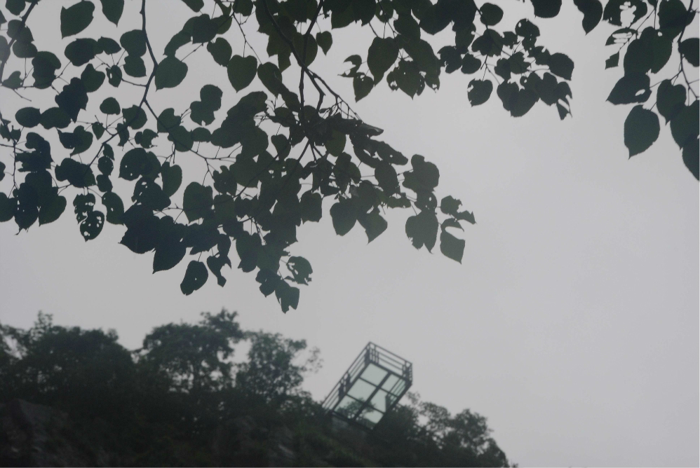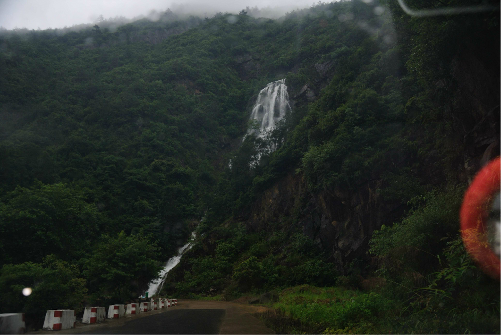 可惜此时的雨大了些,原本可以上到这个瀑布顶上去一览全景,可惜由于下雨,山路封了大家不可以上去啦,只能呆在下面望着这个透明的景观台望台兴叹了,上个图大家也兴叹下吧~哈哈~