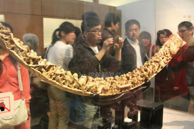 这是用一整根象牙雕制而成的,(请自动忽视背景),雕刻的是熟么我现在忘记了,求解答。雕刻技艺之精湛还是令人叹为观止的。