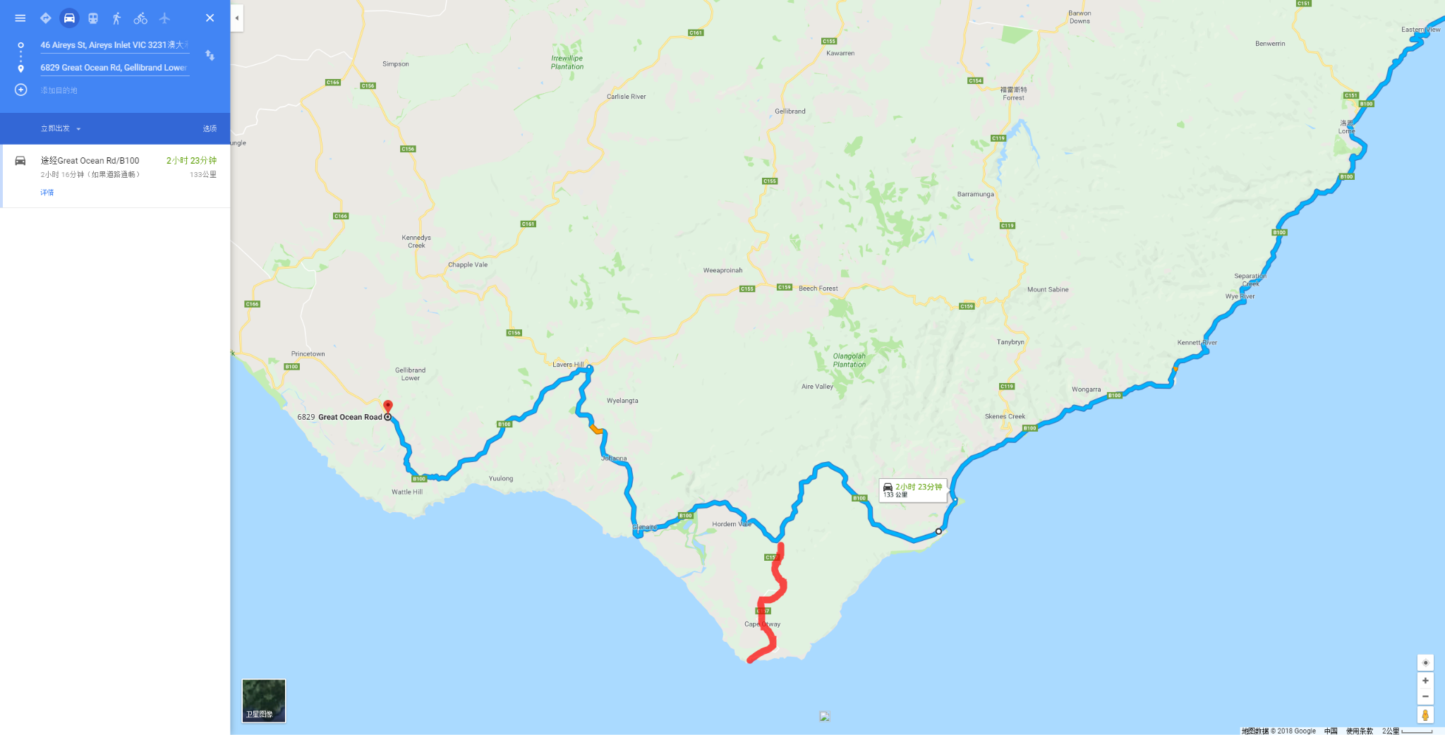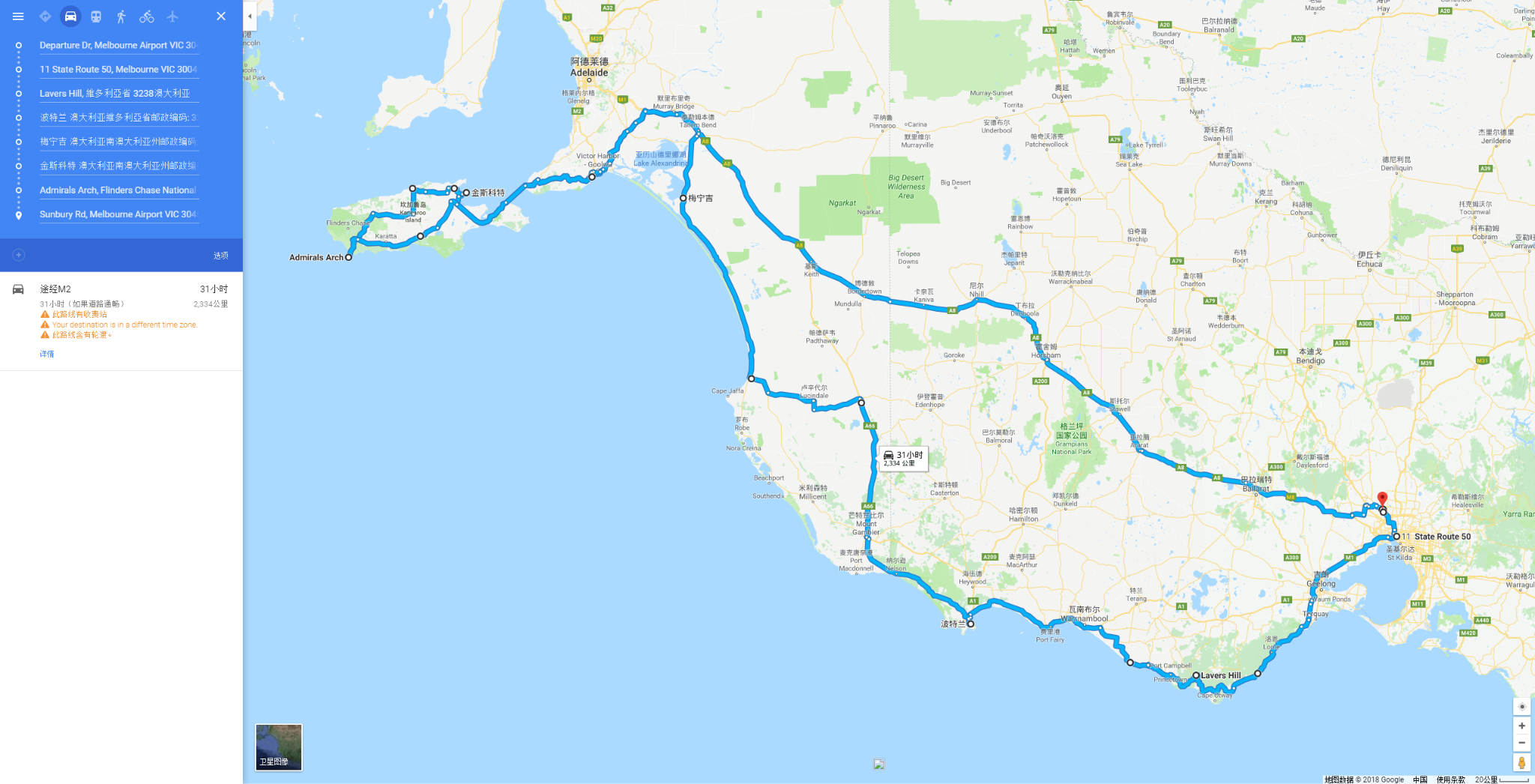 图中的蓝色线路,从墨尔本至十二门徒岩的这段,大洋路的前半程,对于境外自驾新手来说不太友好,路窄,弯急,如果不熟悉左舵我感觉还是比较危险的。
