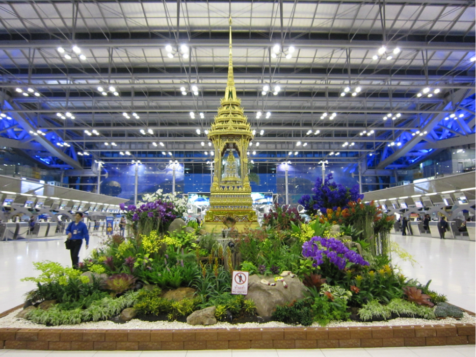 四楼出发大厅。当时感慨泰国 机场太有爱了,用这种花园式的景致布置大厅,后来在旅途中发现泰国 几乎家家户户都有一个小院,每个小院里必定会重伤花花草草,还会立一两个佛像。机场也延续了这种风格。