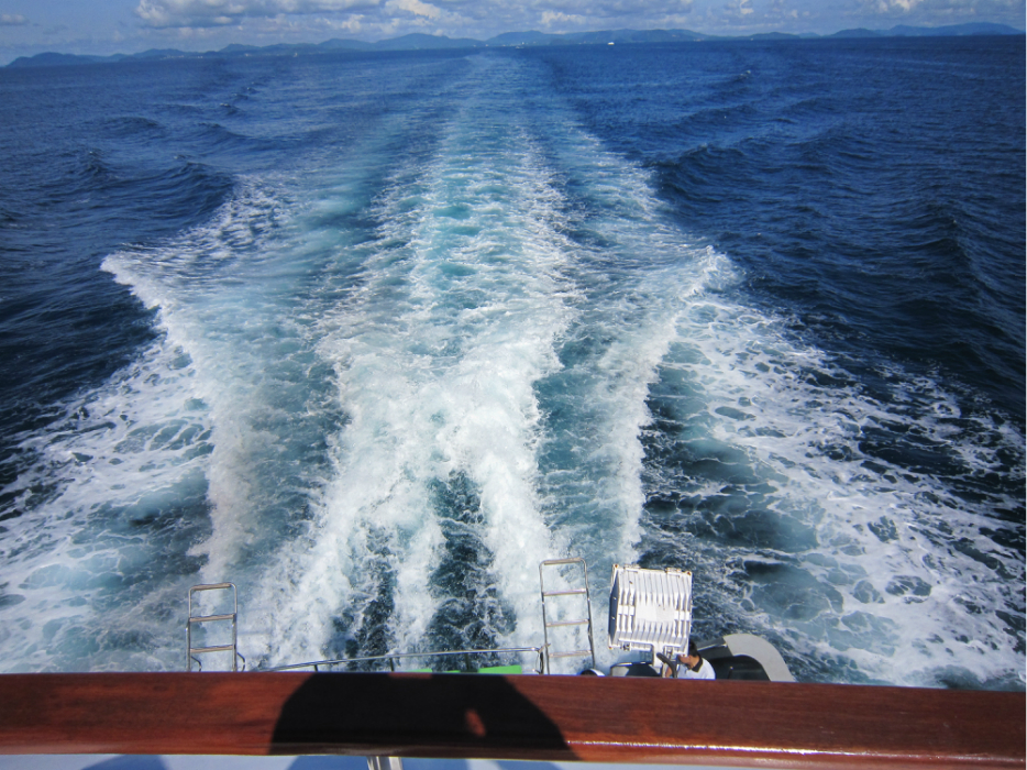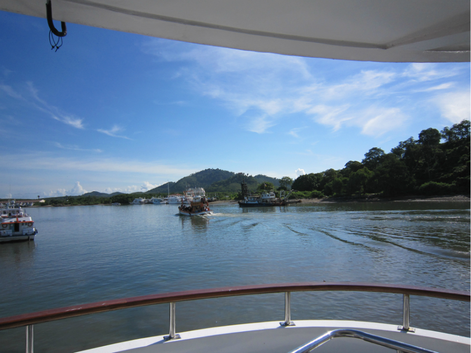 返程还是坐得来时的大汽艇,唯一不同的是,返程时暴风骤雨地,汽艇晃得很厉害。小卡小敏都难受得要死。我们为了防止呕吐,上到甲板上淋雨吹风,他们选在在舱里休息。其实吹吹风还是很不错的。