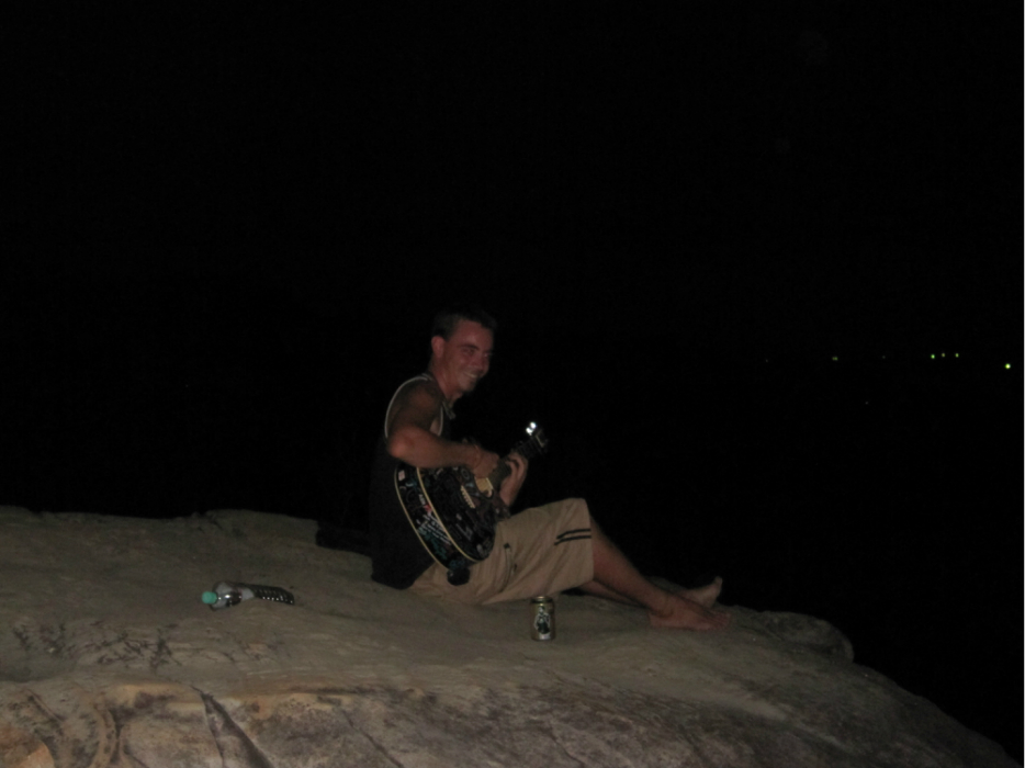 还有一哥们很惬意地谈着吉他,身边放着一罐啤酒,发觉我们在讨论他还很善意的给我们败了一个POSE。