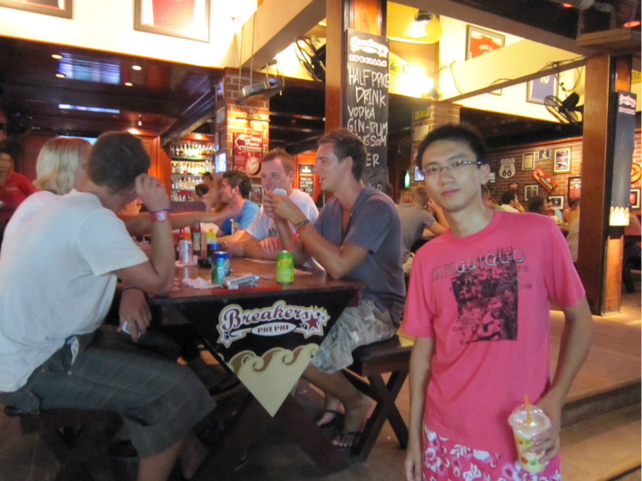 我是看到相对气派的tiger就兴奋地冲进去了。可惜我们去得太早,最开始不怎么热闹,没有表演,没有乐队,有点down。。有些泡吧者会到钢管圆台上扭一阵,但也掀不起什么高潮。欧美游客还是玩的最high的,看着她们那么忘我,羡慕啊!到12点左右这里才活起来。人挤到连站脚的地方都没有。对了,鸡尾酒200B一杯,还蛮烈的。