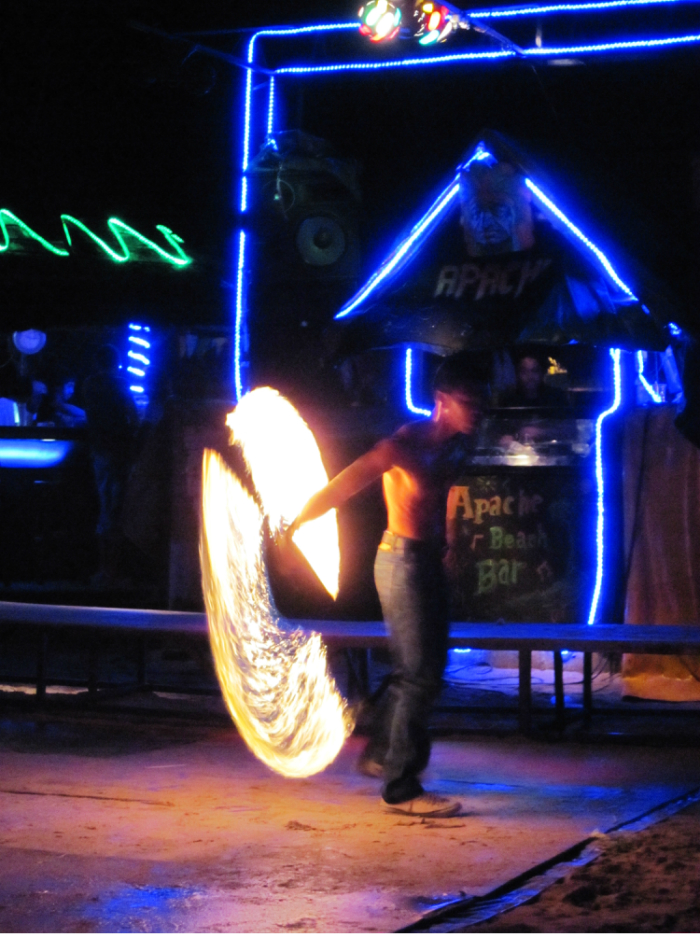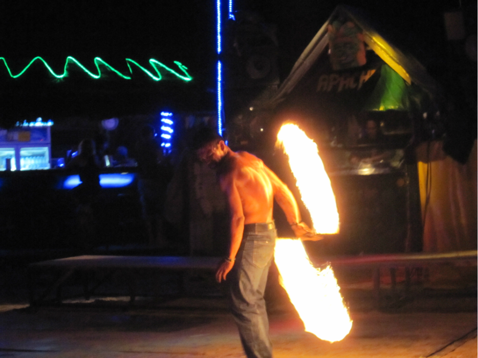 我们去“探险”了,我们三个都是路痴,毫无方向感,被老公带着穿这儿走那儿,结果来到了海滩边。没想到海滩这边正热闹呢!海滩边有好几家酒吧,几乎每家酒吧门前都有一些表演杂技的人。