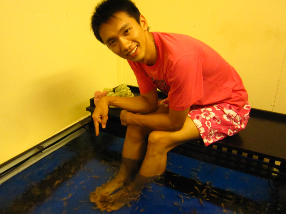 小鱼冲过来咬我的死皮逗得我咯咯地笑个不停。但是老公脚上的鱼比我的多多啦。老公看看我说“嘘,我叫上死皮多,才吸引鱼的,别声张”。哦,原来如此!