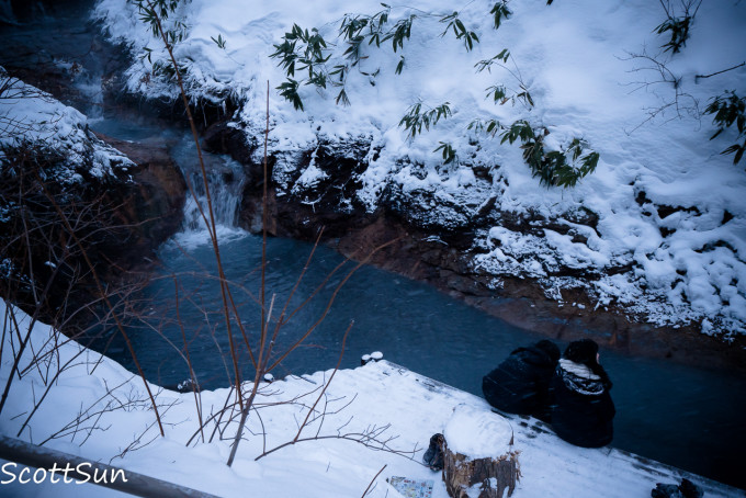 地狱谷~天色渐暗,人群散去,两个霓虹妹子依偎着泡足汤
