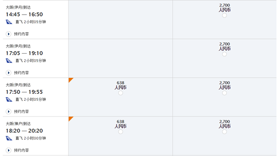 比如我出发前一周搜索我乘坐的ANA 14:45-16:50札幌-大阪这班,因为已经卖的差不多了,就没有优惠票了,原价要2700RMB。