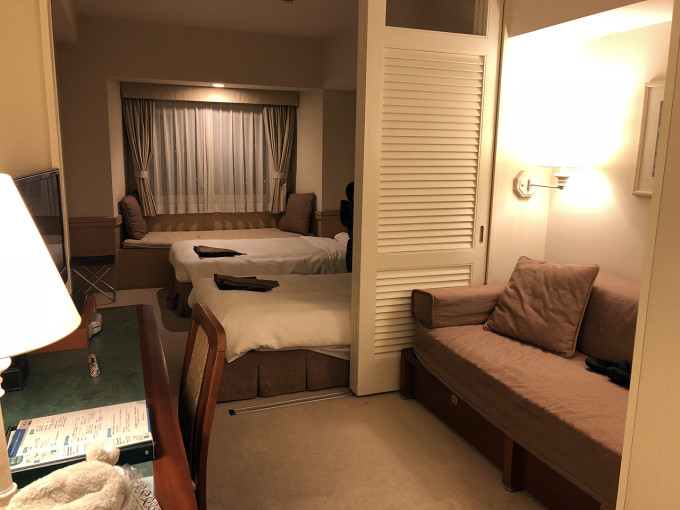 下图的房型有点奇怪,双床+一个沙发,行李是绝对能摊开的。