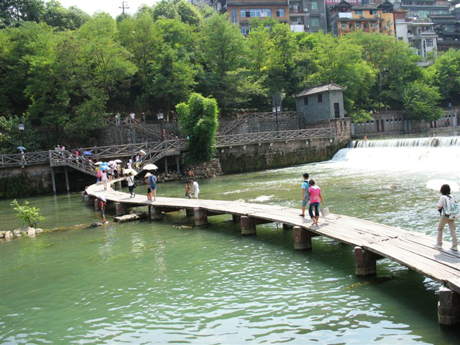 从归一园这块牌坊走下去,就看到了碧绿的沱江。踩着江中的木板桥过去,就来到我们要入住的江源宾馆(/poi/6950363.html)。